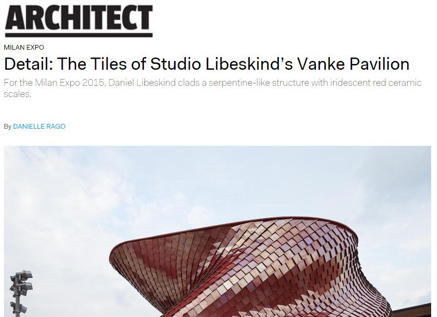 Architect Magazine explores the iridescent, red ceramic tiles covering Studio Libeskind’s Vanke Pavilion at Milan Expo 2015.