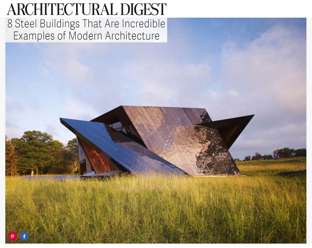 AD rounds up examples of modern architecture that make innovative use of the construction mainstay. Studio Libeskind’s 18.36.54 house in western Connecticut is showcased for its mirror-finished, bronzed stainless steel exterior.