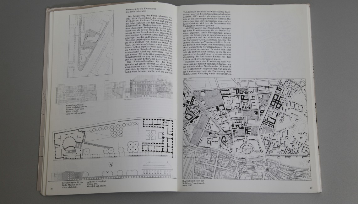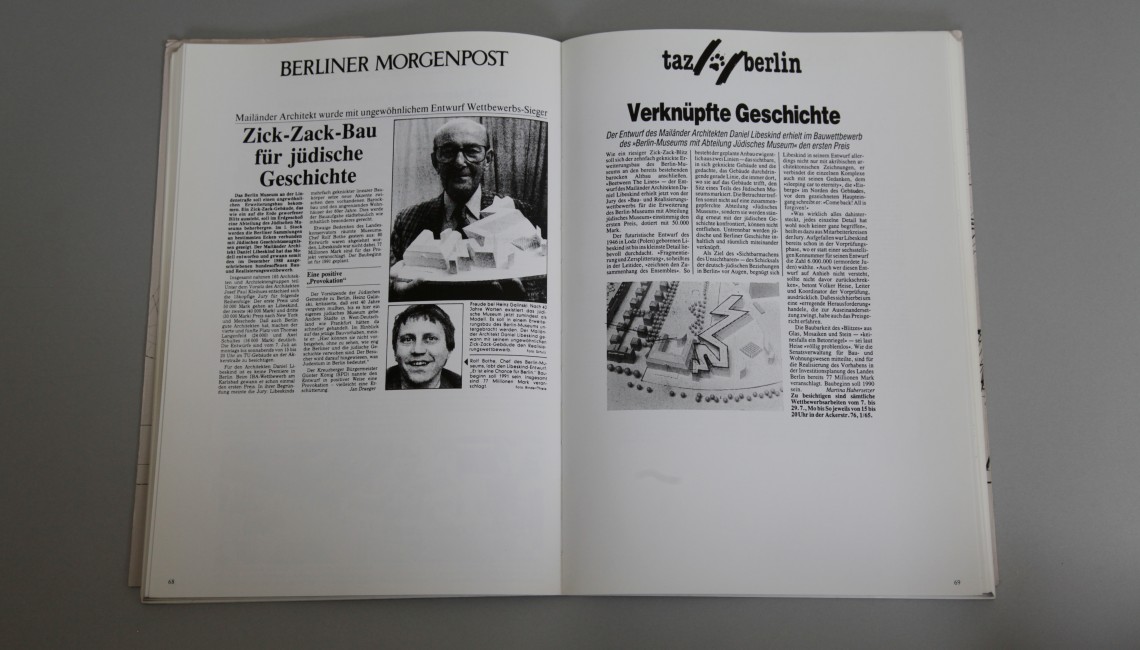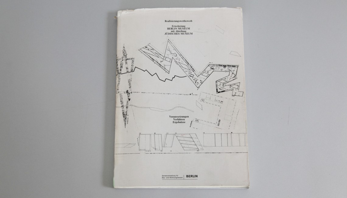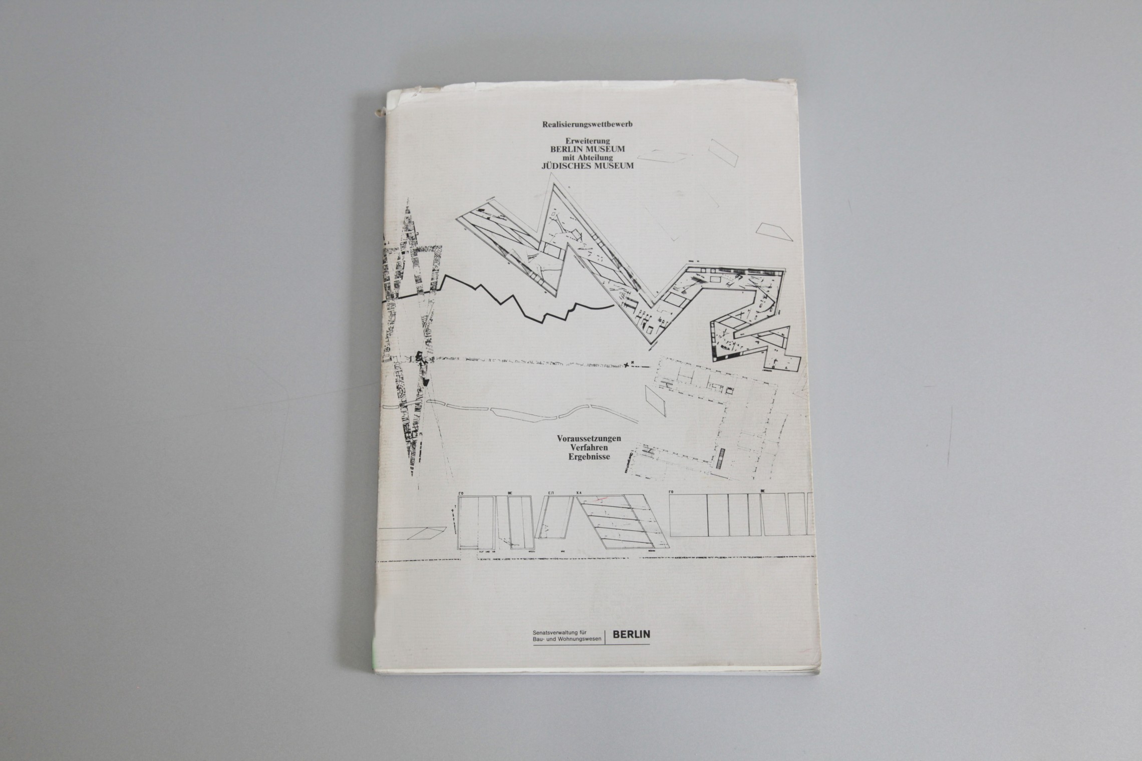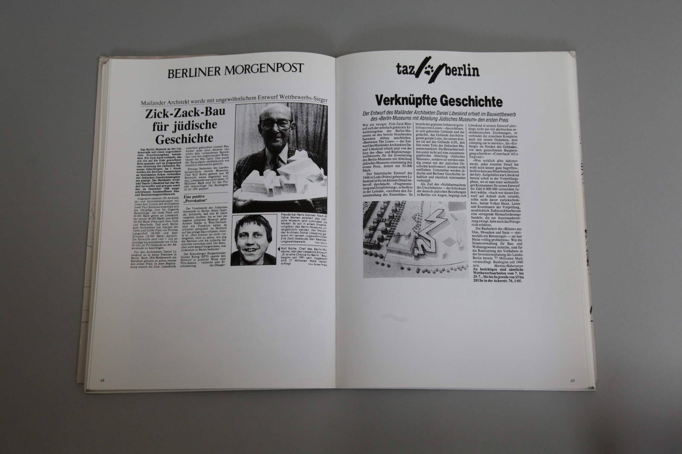 Monograph of the Design Competition of the Jewish Museum Berlin, includes text, architectural drawings, photographs, and newspaper clippings.