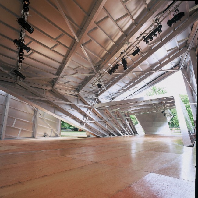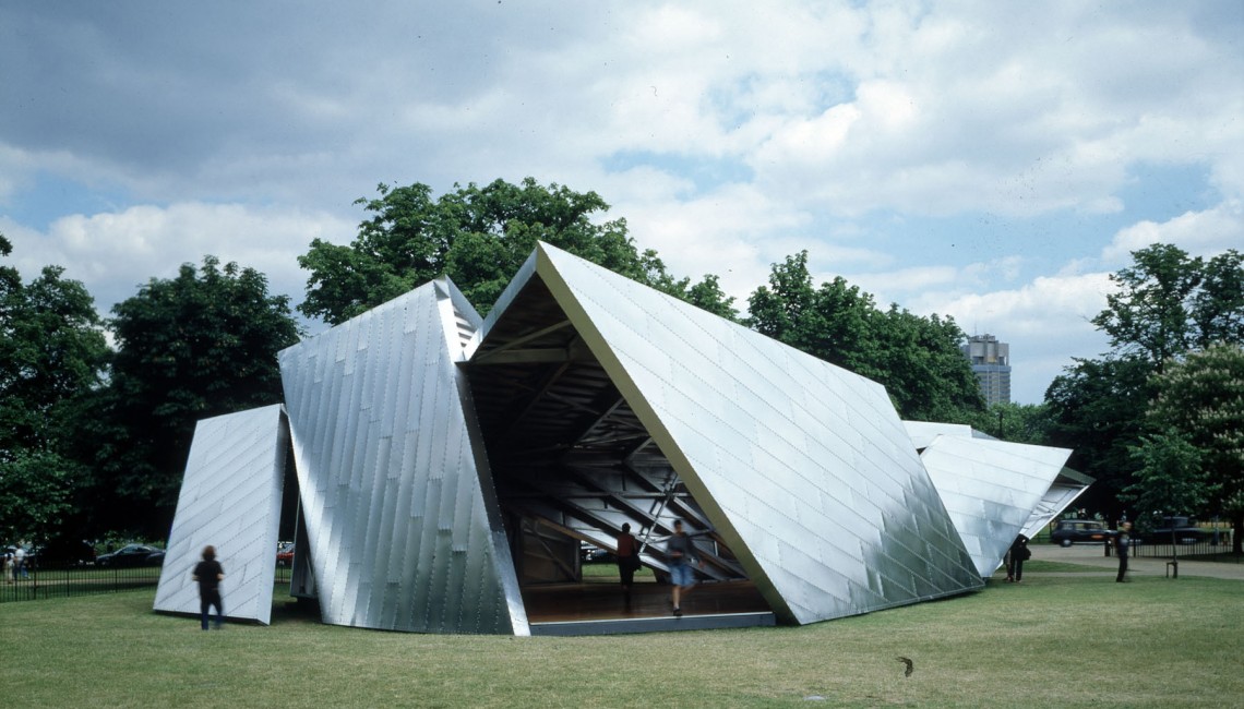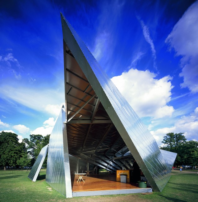 Highlighting the beauty of the Kensington Gardens and their connection to the gallery, Daniel Libeskind’s striking design for the Serpentine Gallery Pavilion 2001, entitled Eighteen Turns, was created from sheer metallic planes assembled in a dynamic sequence.