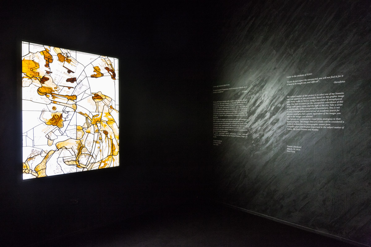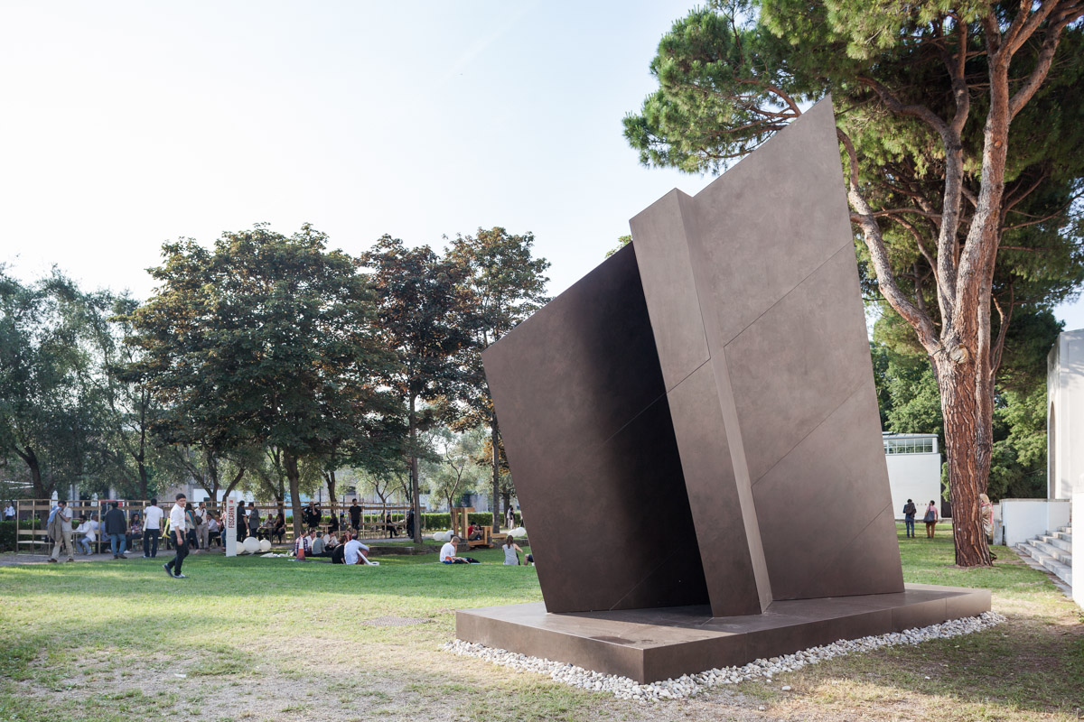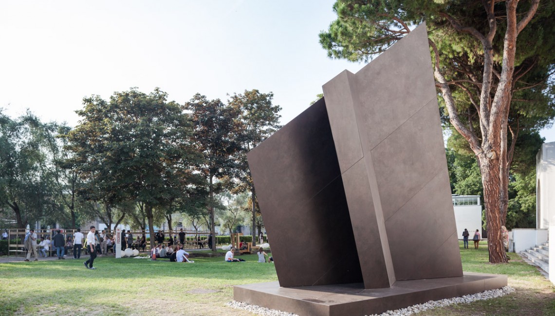 As visitors approach the pavilion, situated in the Giardini della Biennale di Venezia, they will first encounter a 5.5 meter high (18 feet) sculpture of a skewed axis form finished in the brown ultracompact surfacing material Dekton by Cosentino. The geometry of the form relates to the development of the axis as a fundamental to architectural drawing. Libeskind has explored this technical mark in all his major drawing works beginning with Micromegas continuing with Chamberworks, and now in Sonnets of Babylon. This sculptural “X” will serve as a starting point—a virtual beginning of a line that runs through the Sonnets and anchors their exploding and collapsing worlds.