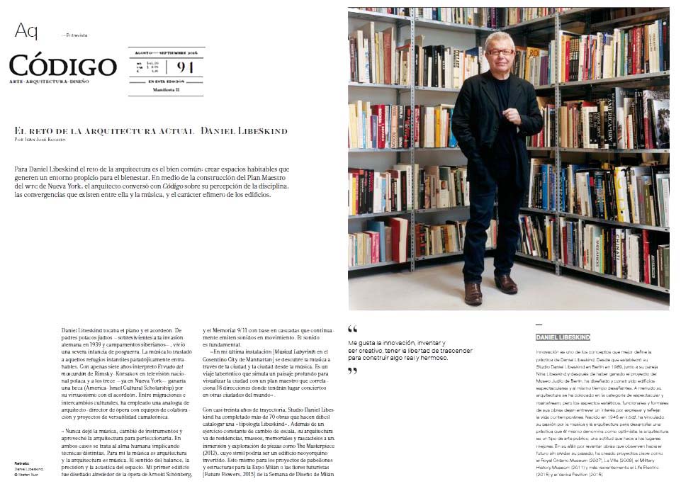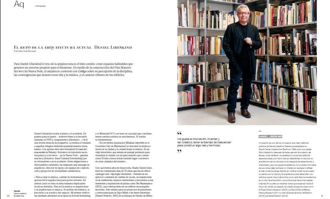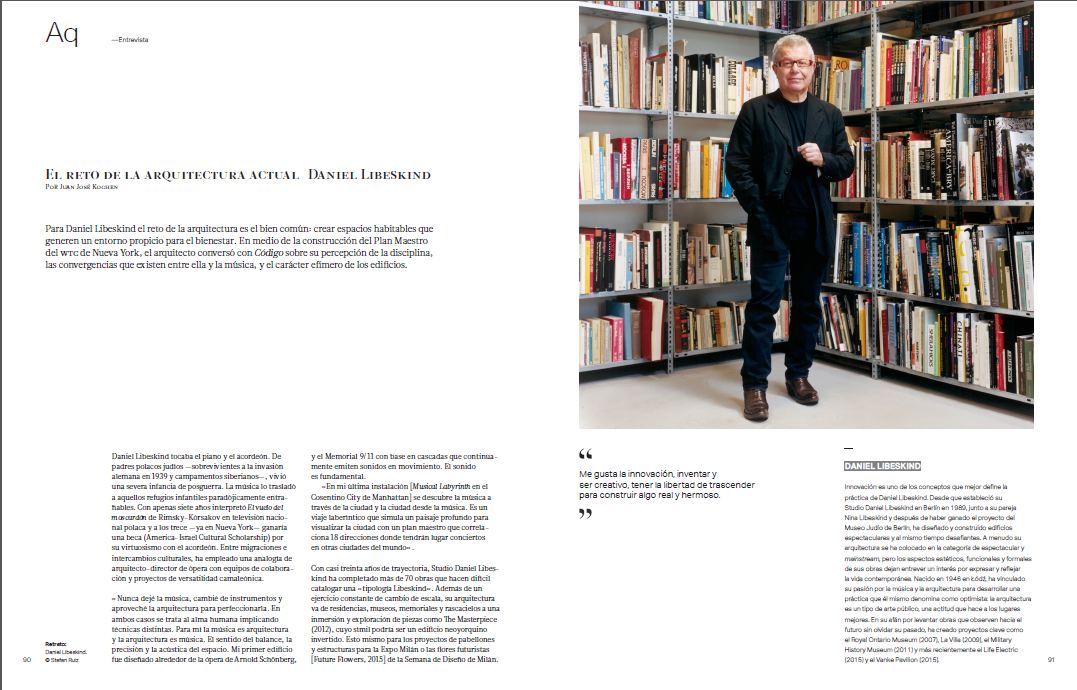 Daniel Libeskind and architecture for the common good. Creating new living spaces that generate an environment conducive for comfort, amid the complicated construction of the Master Plan WTC New York. The architect spoke with Codigo on his perception of discipline, convergences between architecture and music, and the ephemeral nature of buildings.