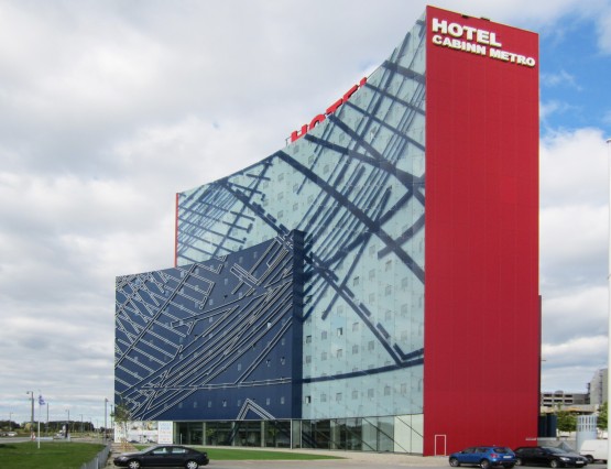 This stylish hotel in Copenhagen capitalizes on its maritime theme by a highly graphic design program and tiny guest rooms made inviting through smart built-ins that echo ship cabins. The building is made up of two intersecting volumes, clad in glass and aluminum composite:   one, lower and straight, and another, higher and curved.  The deep blue and light gray aluminum cladding forms the canvas for line patterns that extend over the main facades in the form of aluminum profiles or etched glass, based on Daniel Libeskind’s drawing series, Chamberworks, while the two end walls are painted a lush, lipstick red….