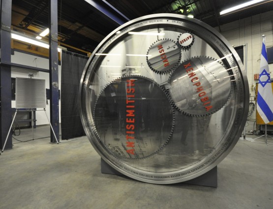 The Wheel of Conscience is a kinetic installation on display in Halifax at the Canadian Museum of Immigration on Pier 21, the gateway to Canada for a million immigrants and now a National Historic Site.  The work was inspired by the story of the M.S. St. Louis, a ship carrying Jewish refugees from Nazi Germany, which the Canadian government turned away in 1939. The work is a heavy steel wheel placed vertically and housing four interlocking steel gears powered by an electric motor.  The words “hatred, racism, xenophobia, anti-Semitism” are applied in relief to the face of the gears. The…