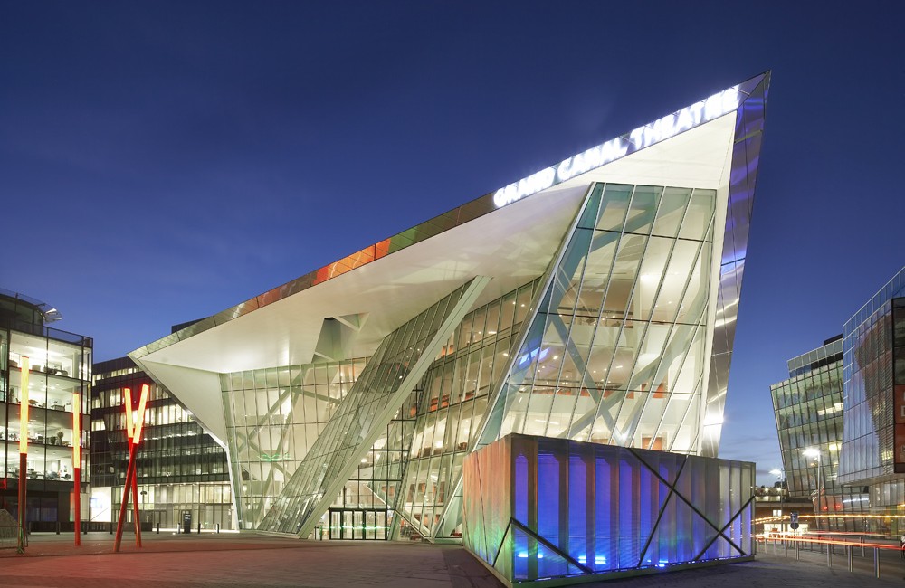 Located on the Dublin waterfront, the Bord Gáis Energy Theatre, formerly the Grand Canal Theatre, is a 2,000-seat theater at the heart of a multi-use complex conceived for by the City of Dublin as part of a plan to revitalize its docklands. Studio Daniel Libeskind completed the theatre in 2010 and an office complex called the Grand Canal Harbour development a year later.