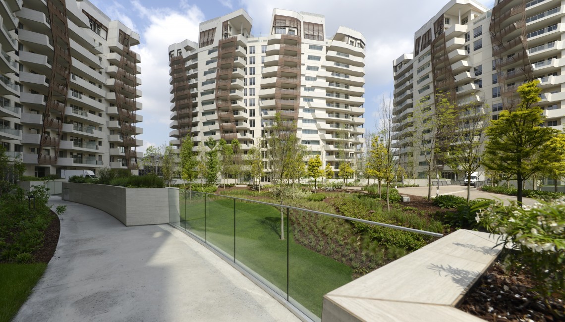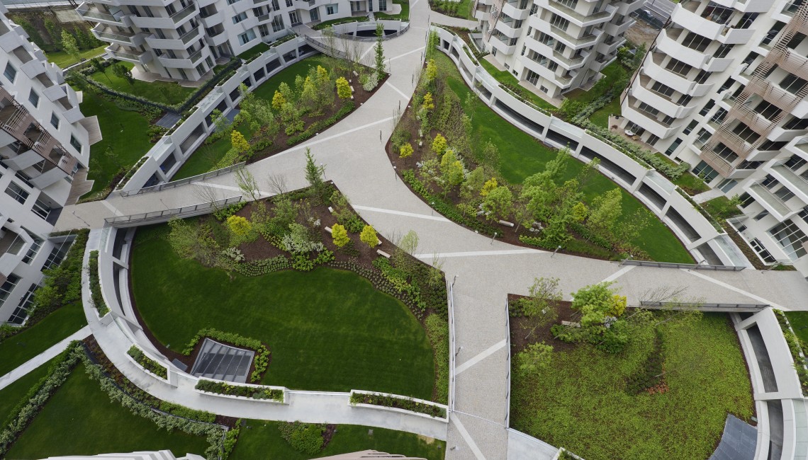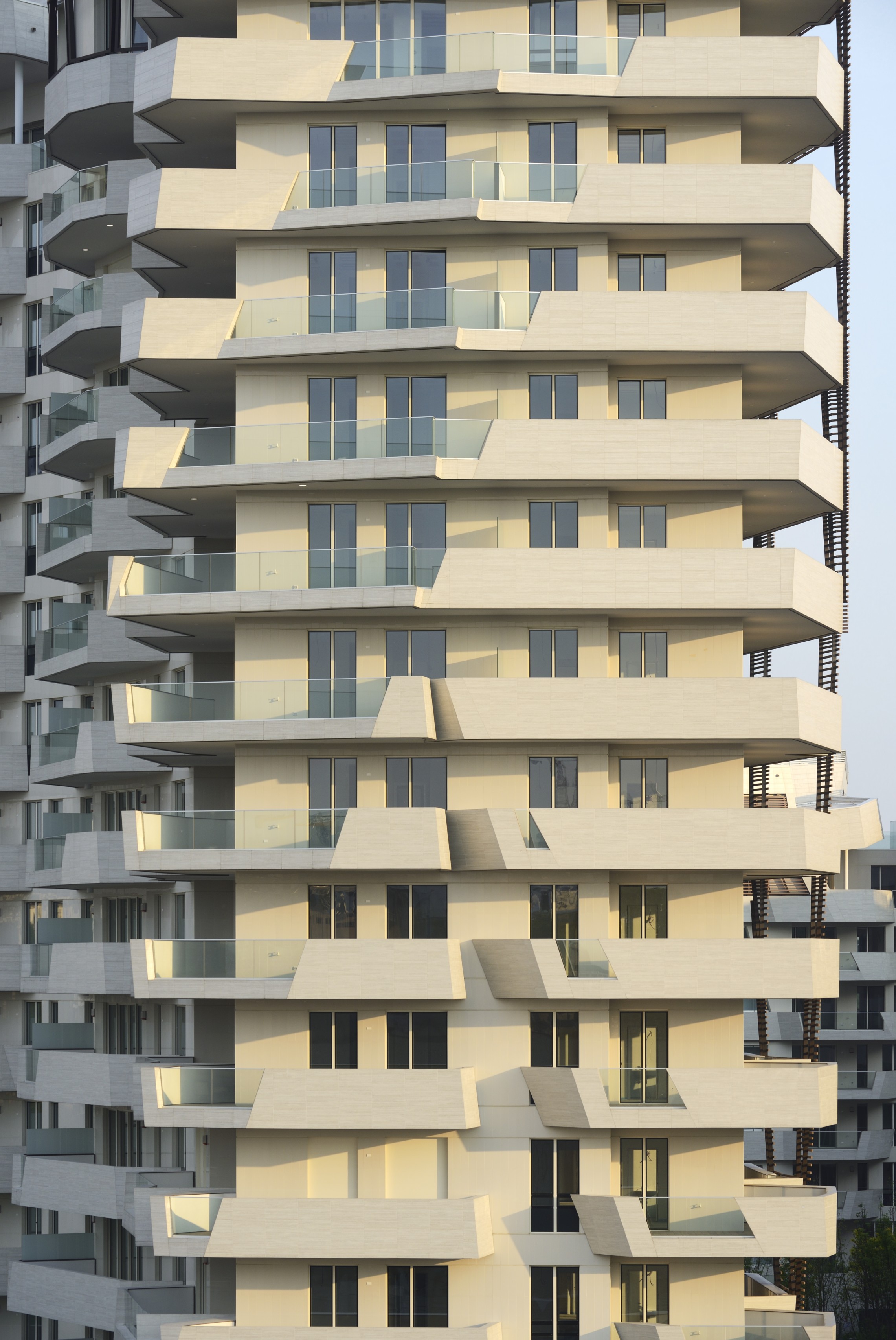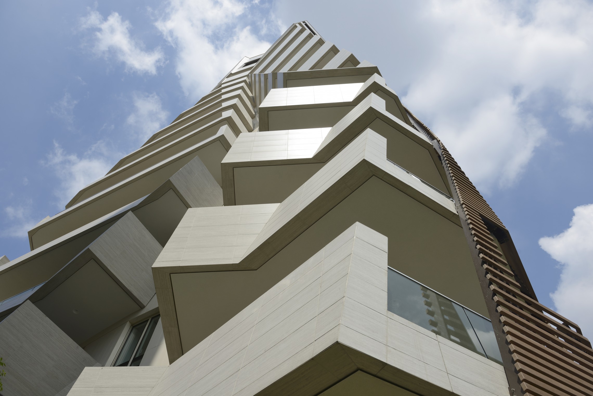 The facades are clad in a finely textured, light grey tile, developed for the project by the Italian tile company Casalgrande Padana. Undulating outdoor spaces create a rhythmic pattern and are draped with a brise soleils, made with new, highly-sustainable composite wood. Each building is topped off by double-height penthouses, conceived as villas, with generous terraces, luxury finishes and city views. Each of these “sky villas” has a completely unique geometry that accentuates the tops of the buildings, integrating the large-scale structures into the rich and varied surrounding urban fabric.