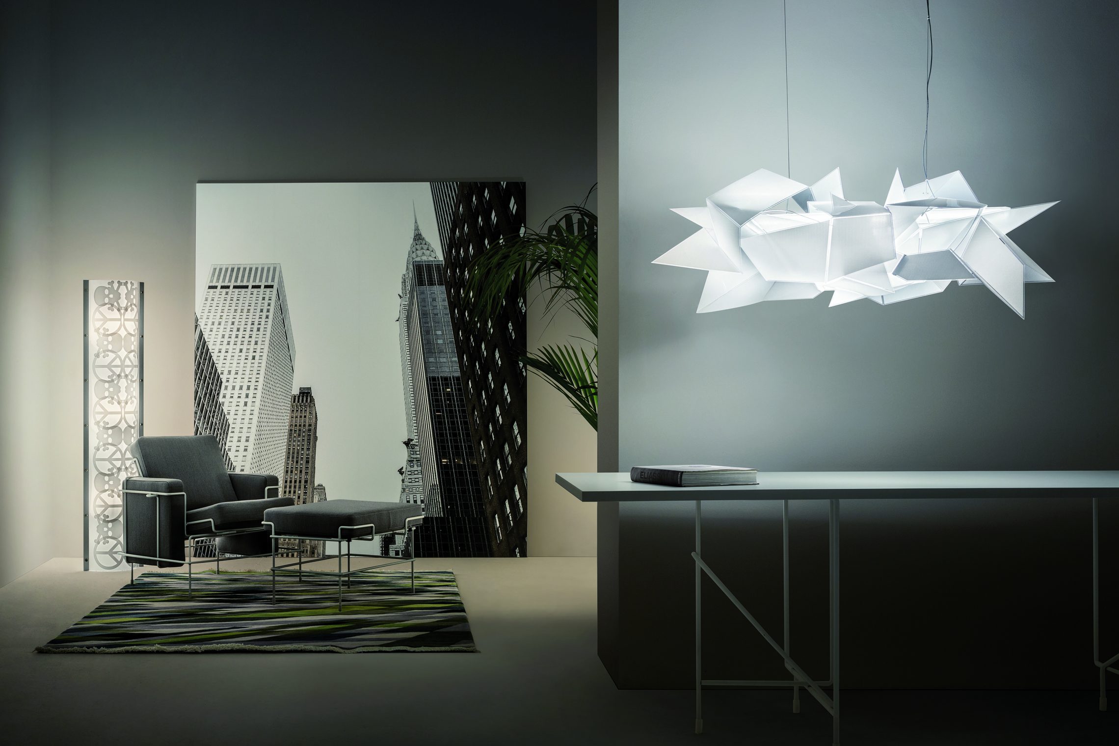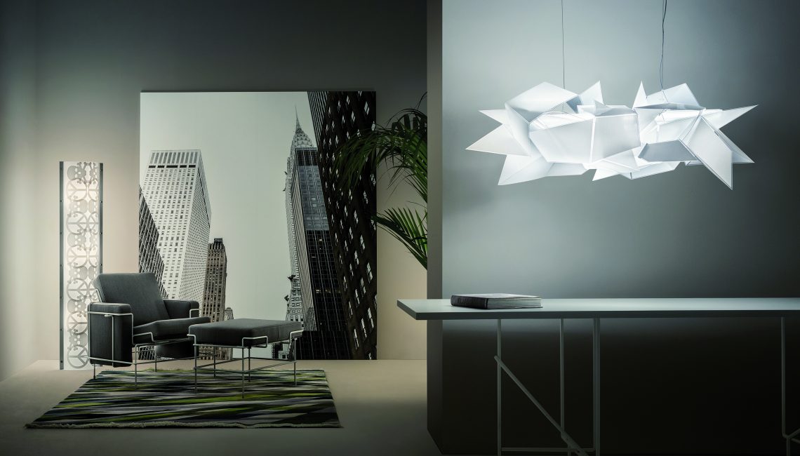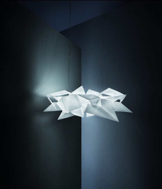Cordoba is an architectural expression of contrasting geometric forms arranged into a harmonious, sustainable, and luminous sculpture that exudes originality. The lamp is a series of asymmetrical fragments that create complex relationship within the form. The design is inspired by the Spanish Cordoba, its architecture and the mysticism of light it inspired. Flat sheets of patented technopolymer material take shape using an algorithm that diffuses the light throughout a seemingly endless structure. Cordoba is handmade, and offers varying points of view even when seen as a whole. Close attention has been paid to maximizing its illumination, creating a perfect dialogue between daring artistic form and the romanticism necessary to enjoy every kind of living area.