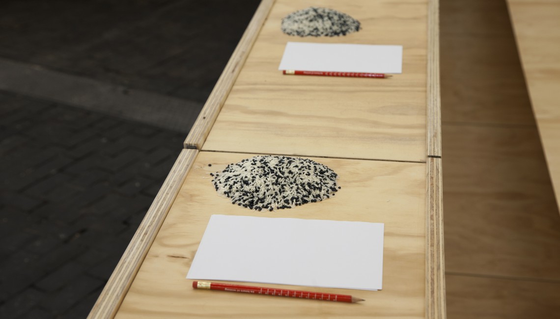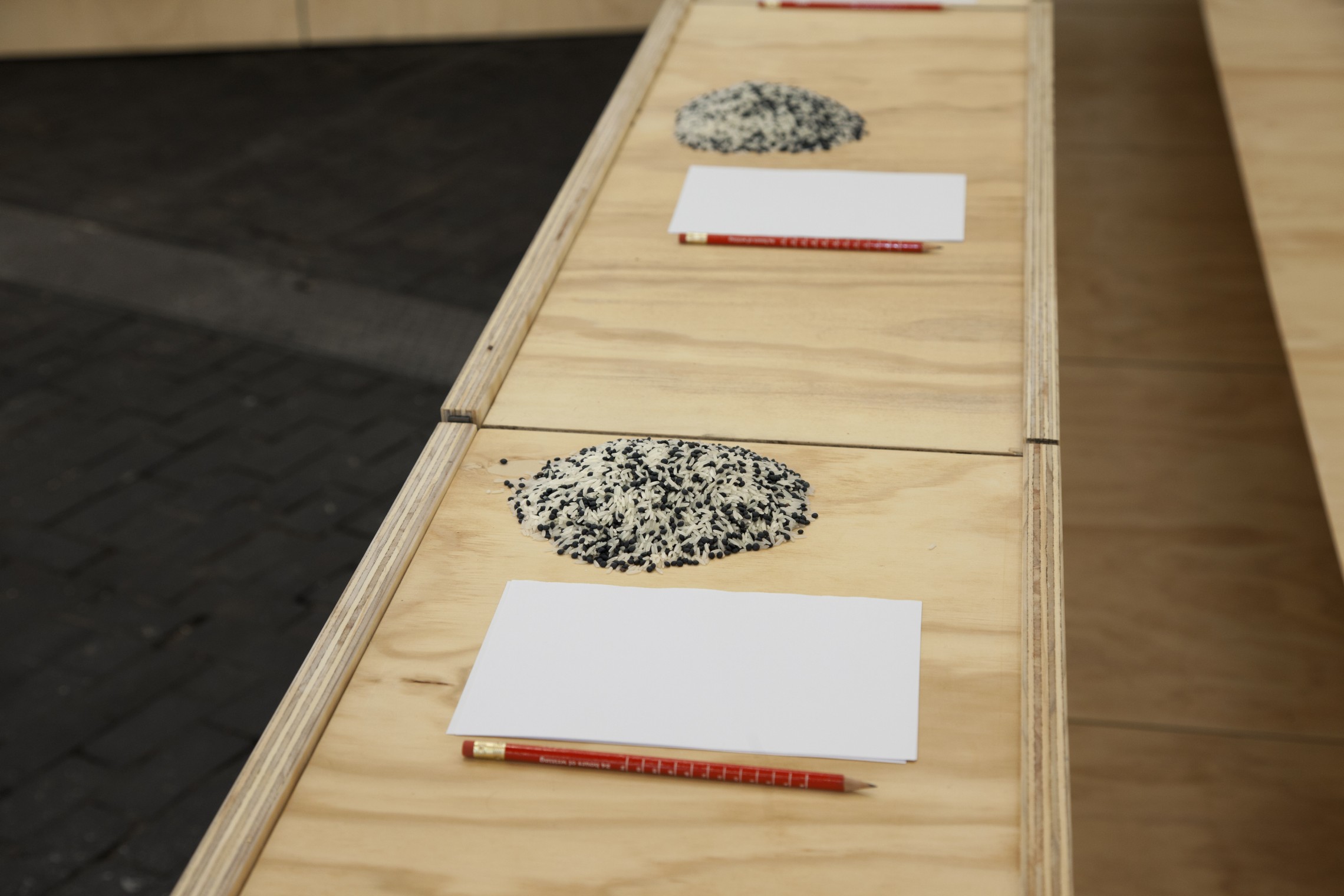 Produced in an edition of 30 by the Italian furniture company Moroso, the table is one piece of high performance soft grey cast concrete, etched with intersecting lines. The first prototype of the table was presented in April 2014 in the Cortile d’Onore cloister at Milan University, during Design Week 2014. Moroso produced a single wooden version for the occasion, used for the ‘Counting the Rice’ exercise performed by students in Milan.