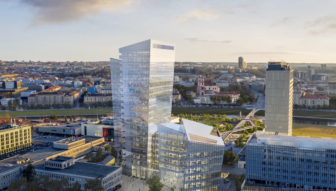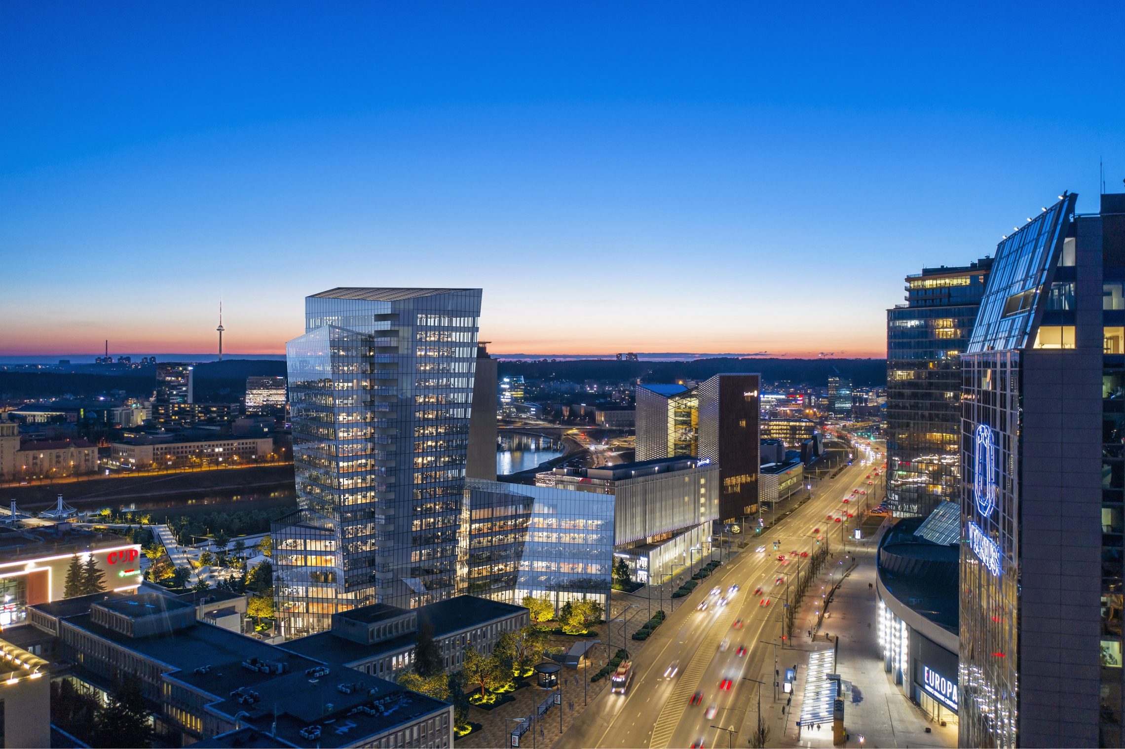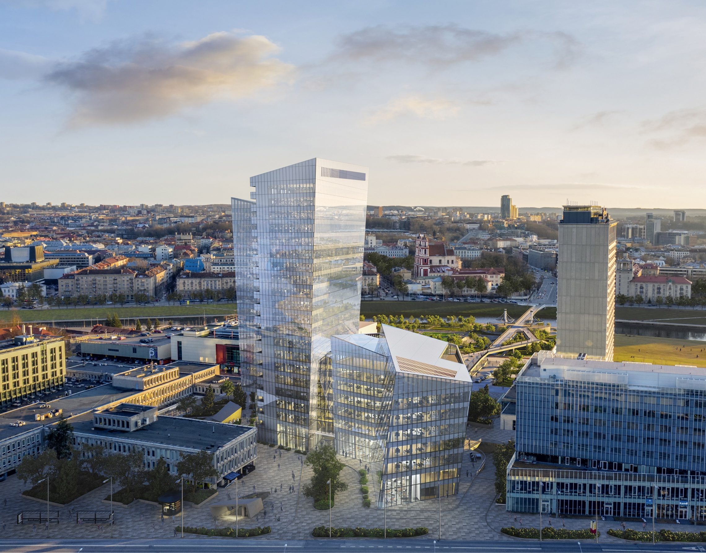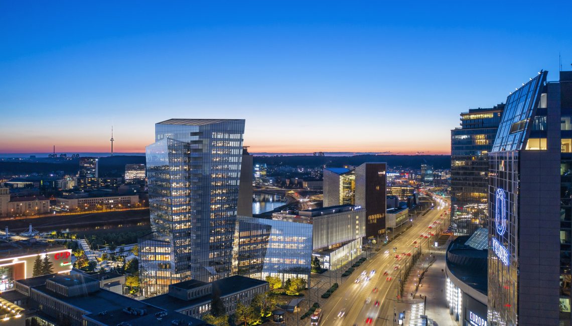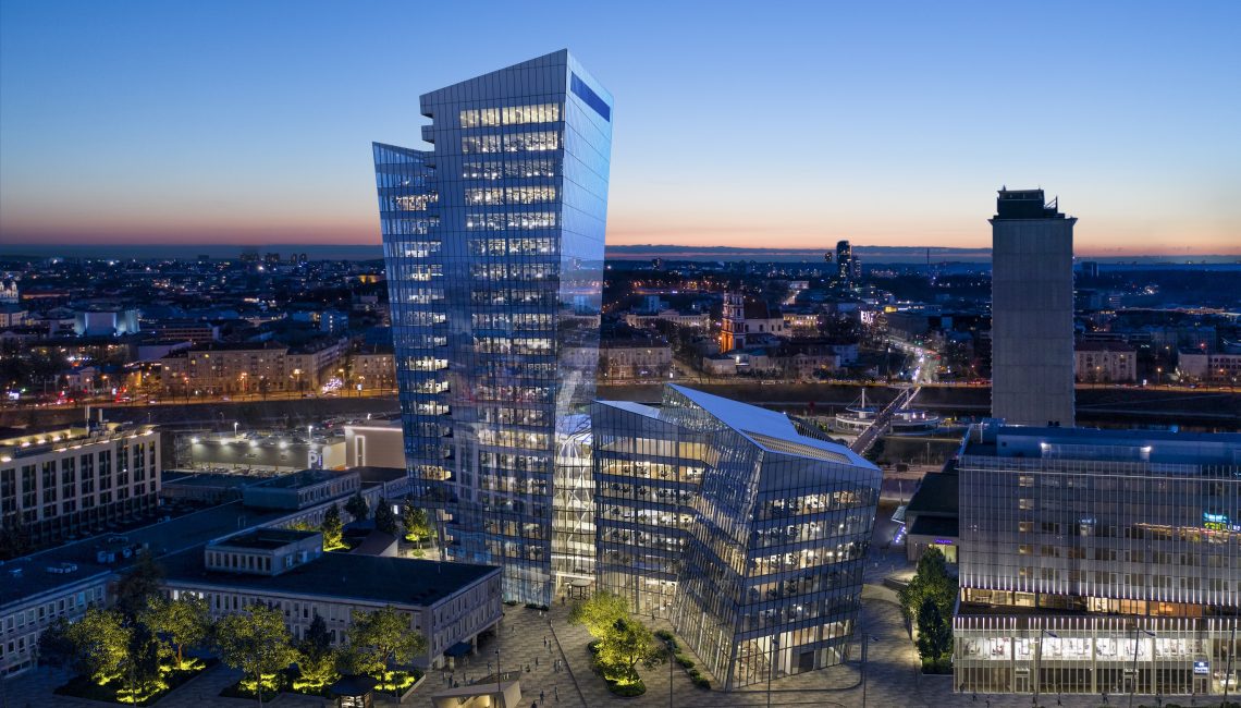 The 20,000 square meter building complex is strategically located steps from the nexus of the White Bridge, Neris River and the Old Town, in the heart of the Vilnius business district on Konstitucijos Avenue 18B. The forecourt across from Europa Square, galleria, and greenspace across from the Neris River waterfront park, synchronize to create an expansive urban space that stretches from the river to the heart of the business district.