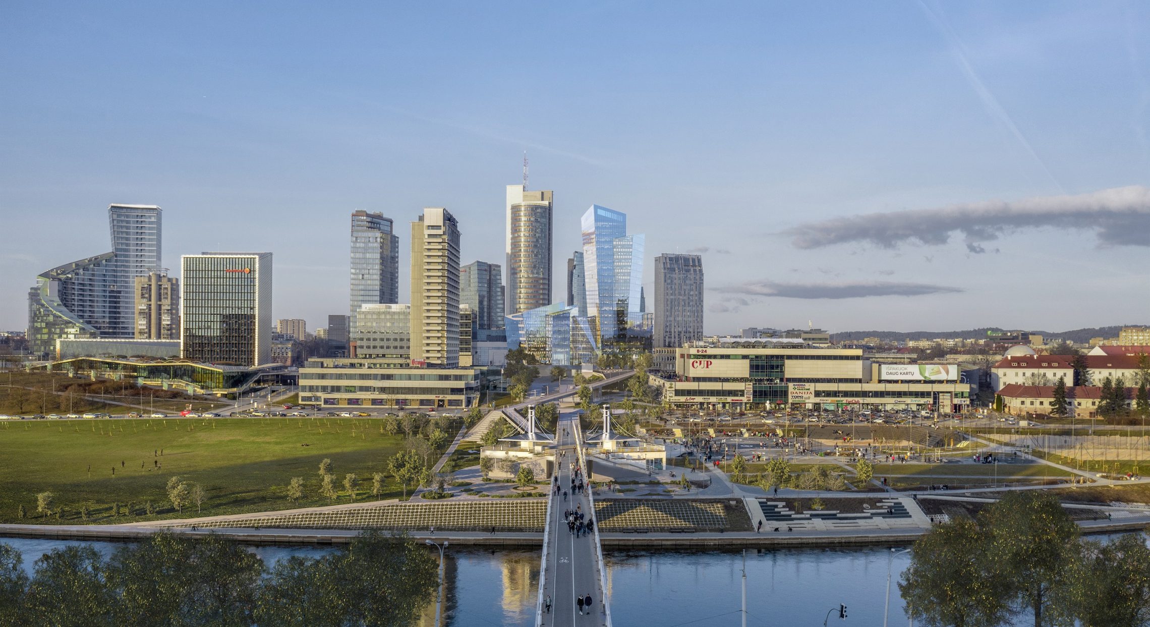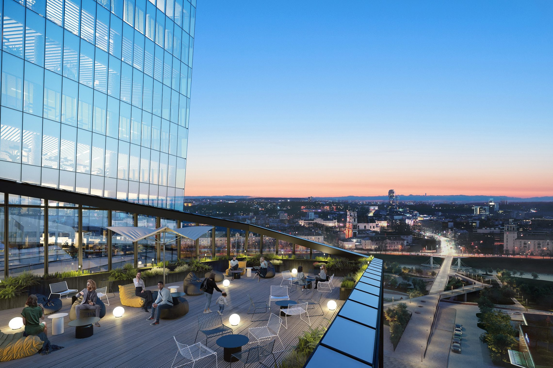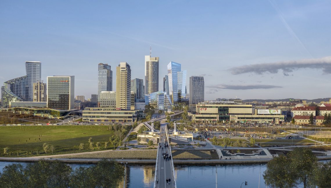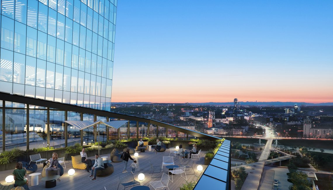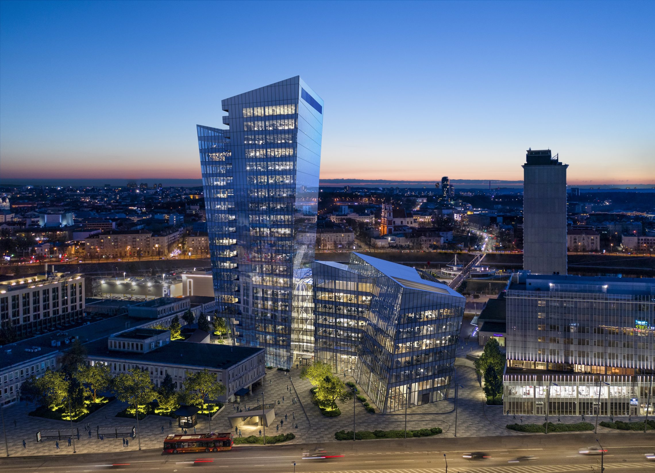 The 20,000 square meter building complex is strategically located steps from the nexus of the White Bridge, Neris River and the Old Town, in the heart of the Vilnius business district on Konstitucijos Avenue 18B. The forecourt across from Europa Square, galleria, and greenspace across from the Neris River waterfront park, synchronize to create an expansive urban space that stretches from the river to the heart of the business district.