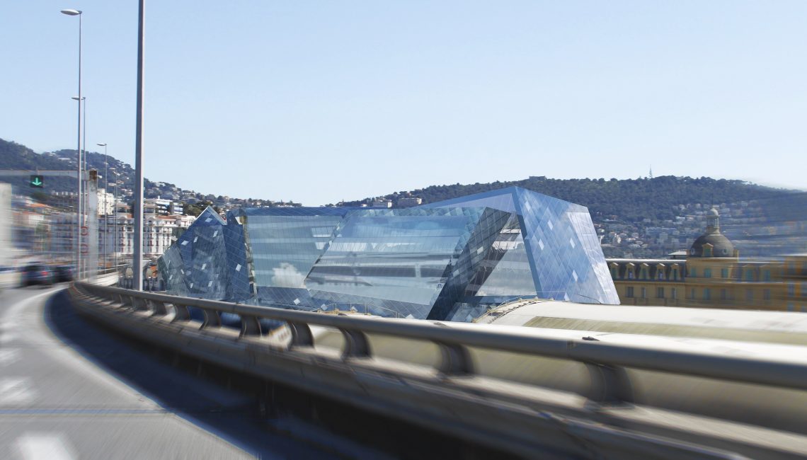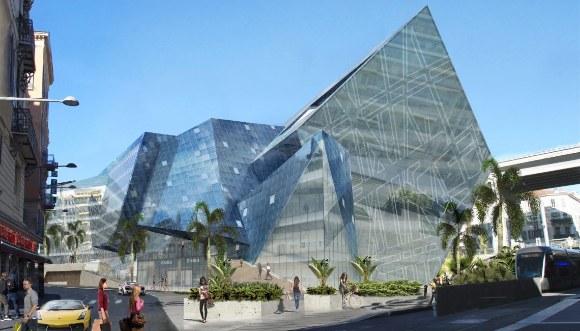 Inspired by the mineral forms of azurite—a mineral endemic to the region—each peak is conceived as a harmonious crystallization whose edges speak to Avenue Jean Médecin. The reflective façade is covered with metal as facets and scales with serigraphs on the windows that reflect the neighboring buildings, sky and landscape of Nice. The result is a sculptural, concrete, steel and glass set, cut like a diamond, with multiple faces rising nearly 40 meters high to obscure the rail tracks.