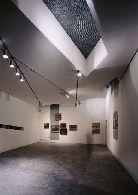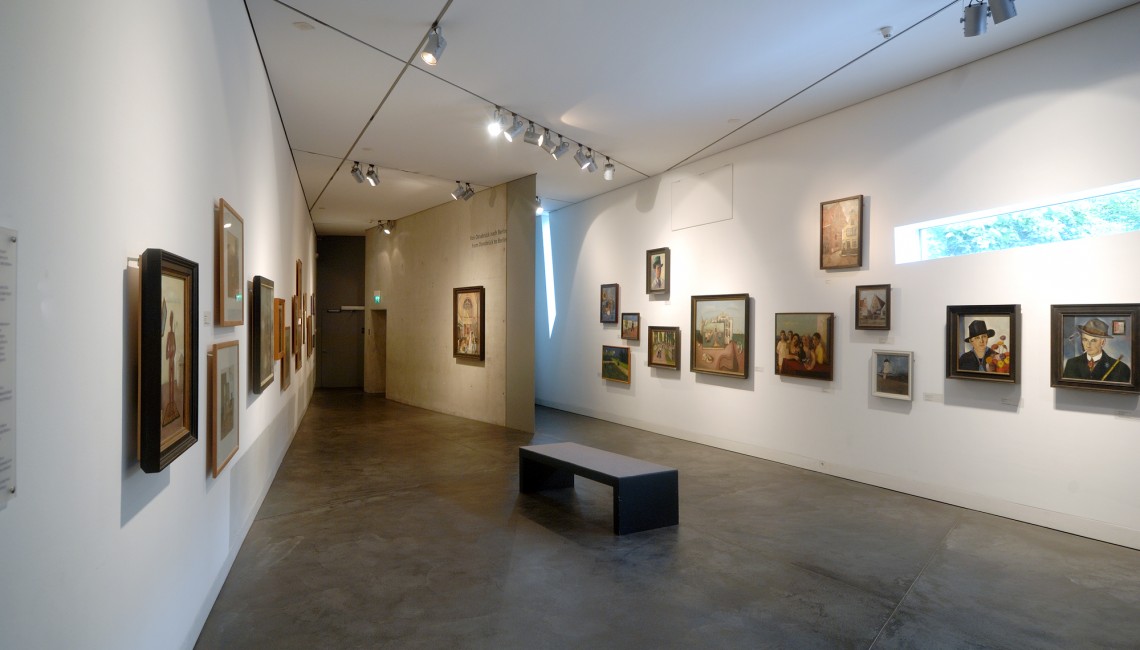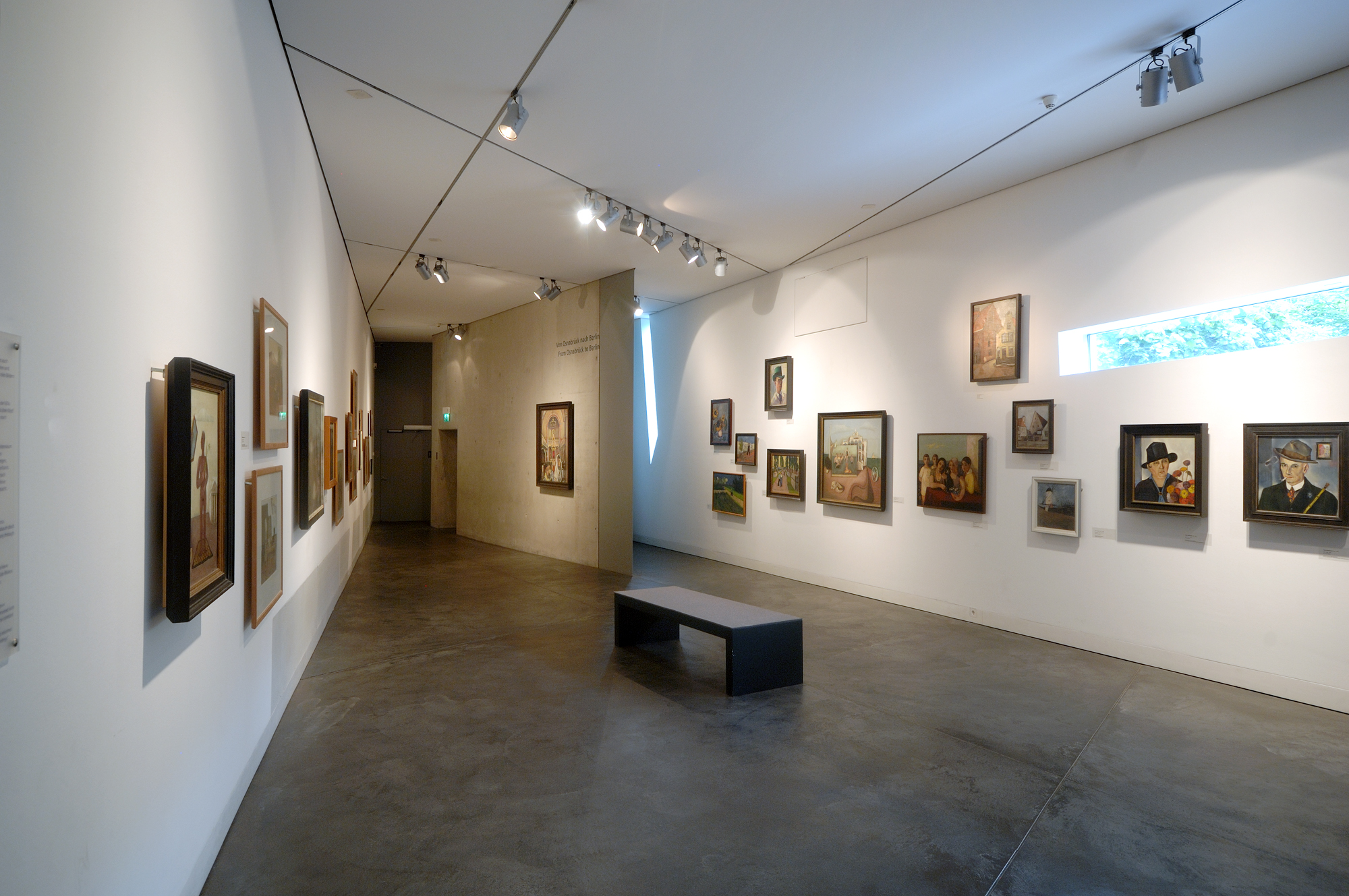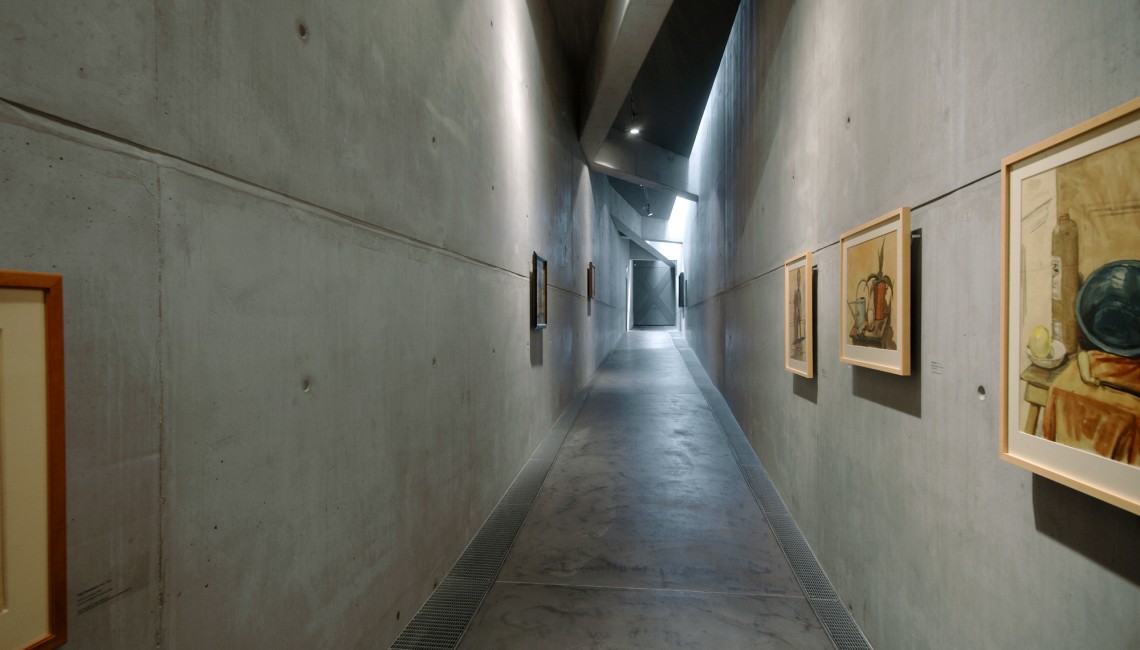 Visitors enter the first volume by a tall and narrow central corridor, whose concrete exterior is a blank canvas and whose interior is a constricted space without horizon, evoking a visceral sense of how Nussbaum painted during his incarcerations, which is necessary to understand his oeuvre. The corridor connects with the building’s other two sections—a long main section, made of wood, containing his early paintings, and a zinc-clad bridge building containing newly discovered works of Nussbaum and connecting to the old museum. The circulation route disorients and creates temporal disjunctions in the curatorial staging of the paintings—the experience is not unlike going backward and forward in time.