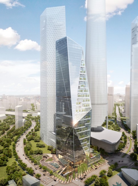 The tapering of the base helps transition the tower to the pedestrian plaza. It expands in the middle to maximize square footage and views to the Han River and tapers again at the top to allow maximum light for neighboring buildings.