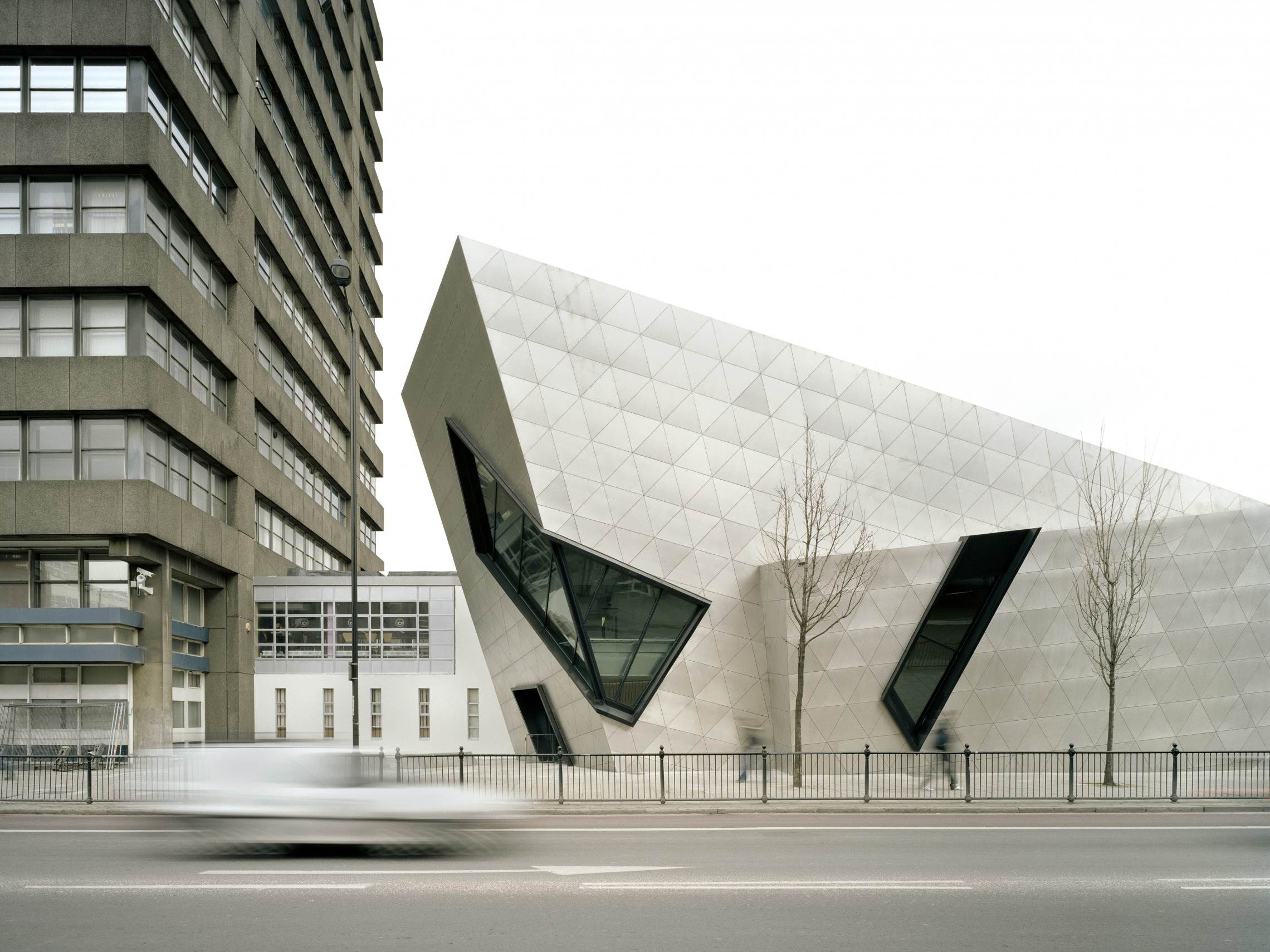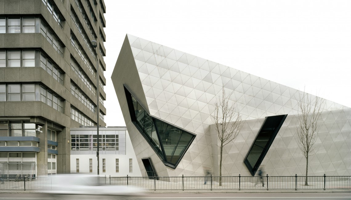 Composed of three intersecting volumes, clad with embossed stainless steel panels for a shining and ever-changing surface, the Graduate Center houses a lecture theater, seminar rooms, staff offices and a café for the university’s graduate students. The interiors are filled with natural light by way of large windows of geometrical cuts and slashes. The Centre serves not only as a facility to enhance the staff and student experience, but acts as a major gateway to the University on Holloway Road.