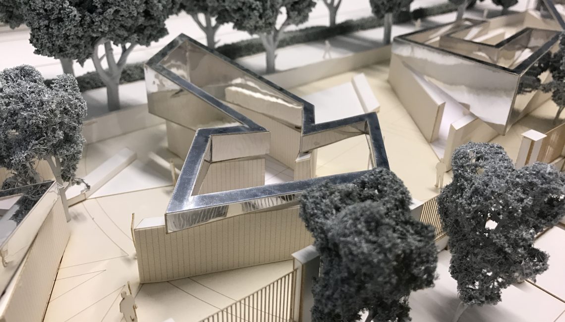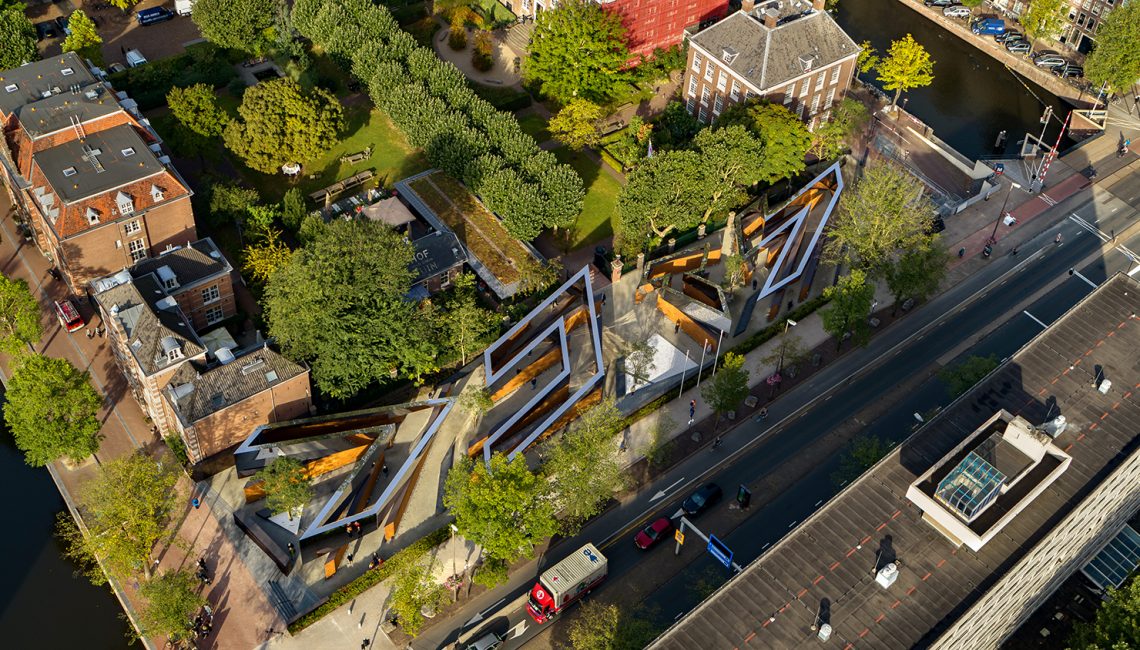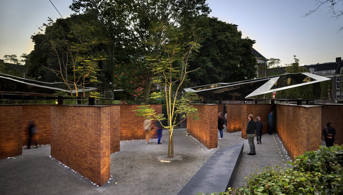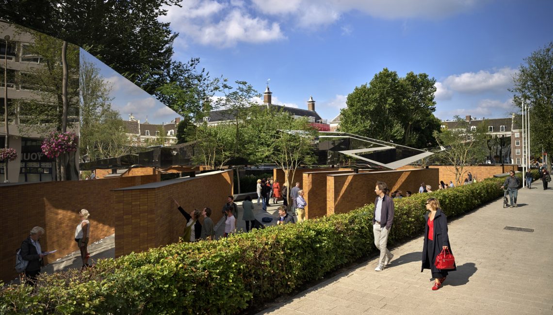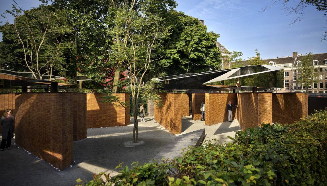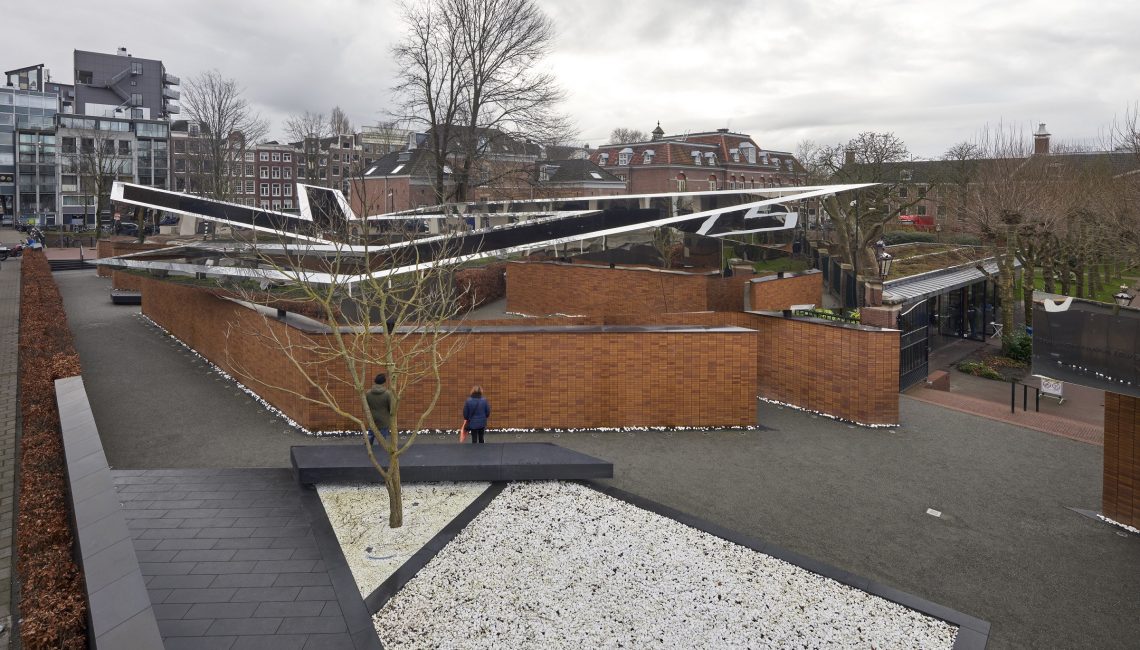 The 1,550 square meter memorial incorporates four volumes that represent the letters in the Hebrew word לזכר meaning “In Memory of”. The volumes are arranged in a rectilinear configuration on the north-south axis of the main thoroughfare Weesperstraat and the Hoftuin pavilion to the East.
