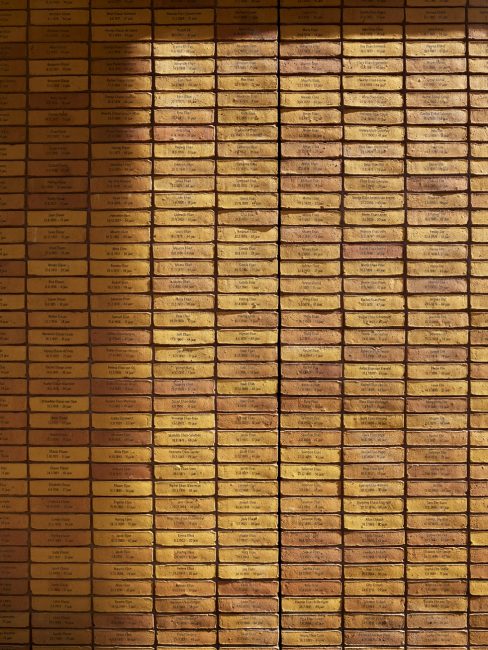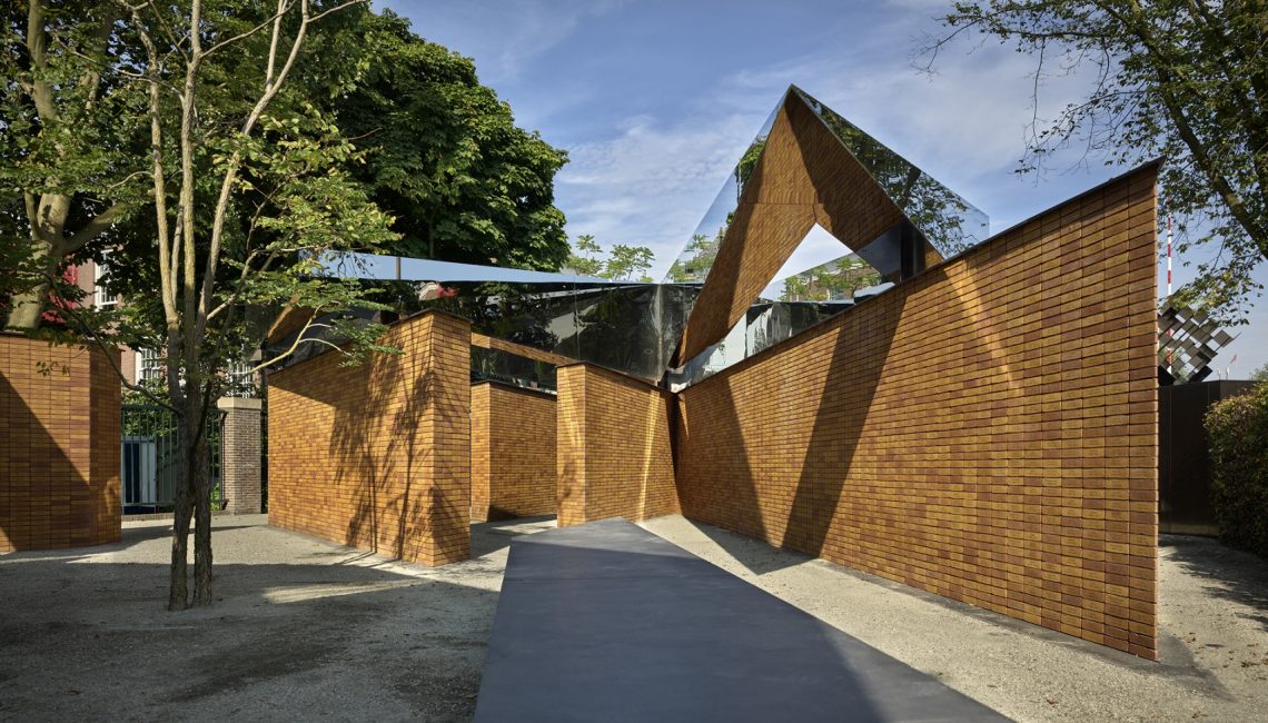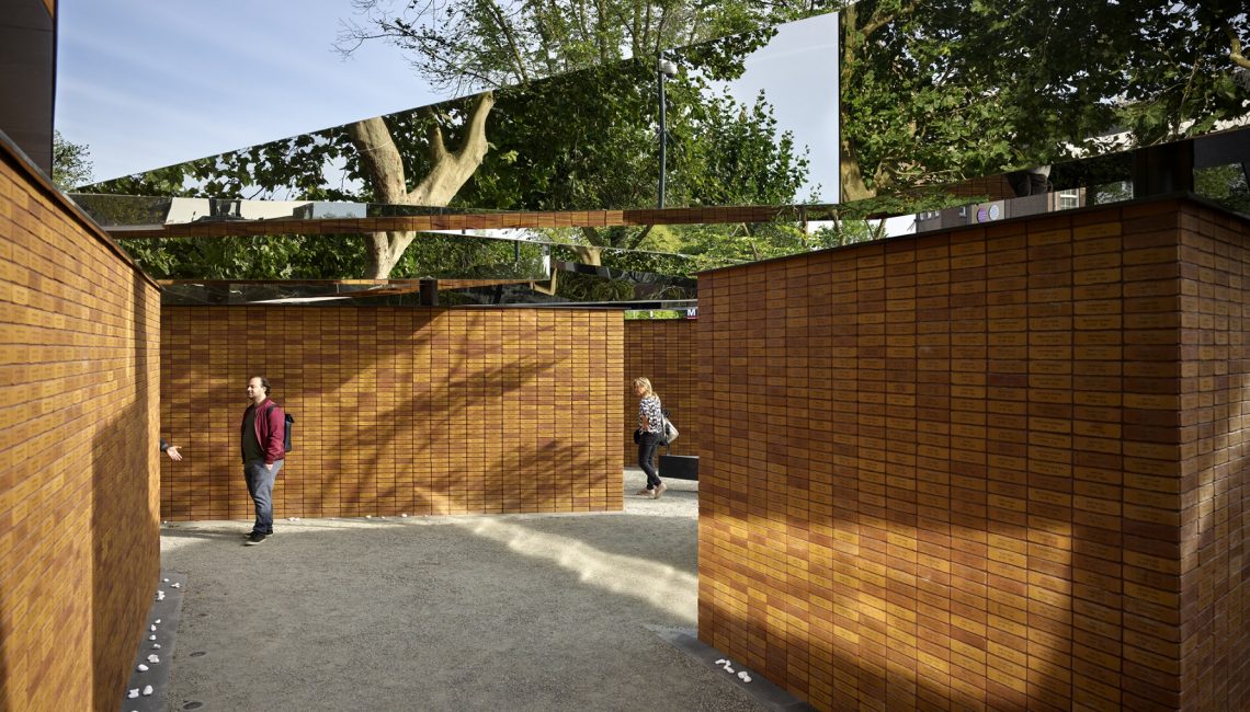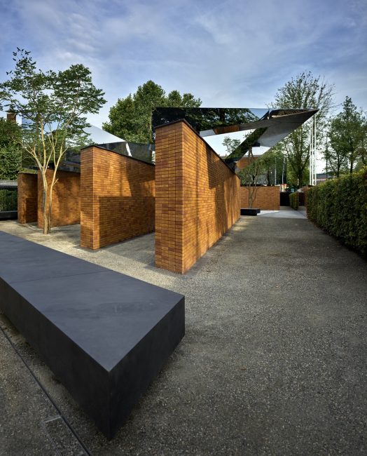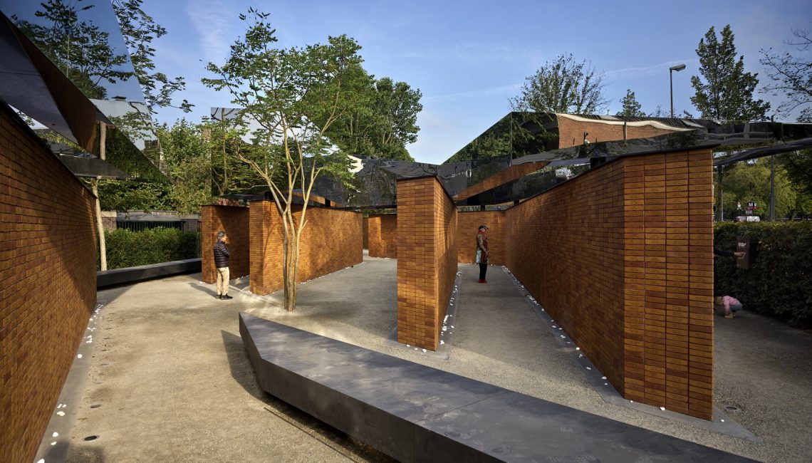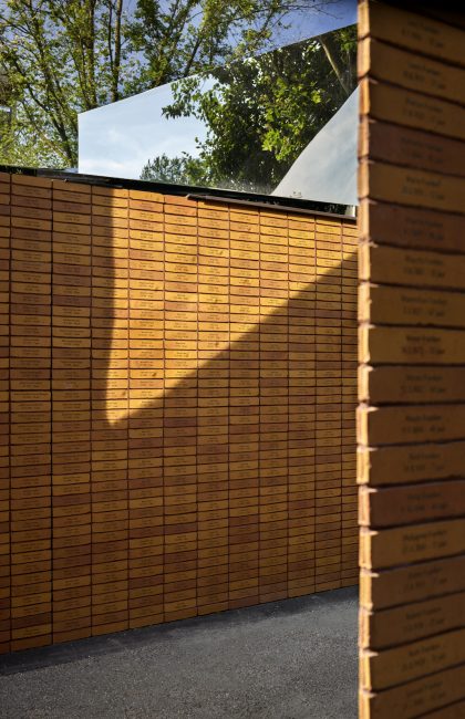 As visitors enter the memorial they will encounter a labyrinth of passages articulated by two-meter-high brick walls carrying the message of Remembrance. Each of the four volumes is crafted from mirror-finished stainless steel that hovers above the walls of individually stacked bricks. 102,000 bricks are each inscribed with a name, giving a tangible quantification to the many casualties, as well as leaving 1000 blank bricks that will memorialize the unknown victims.