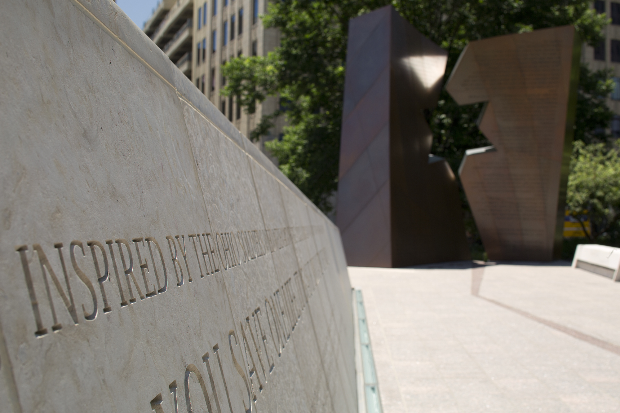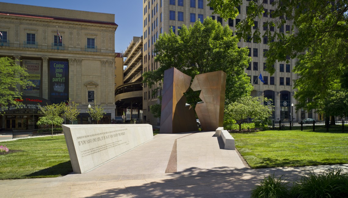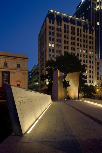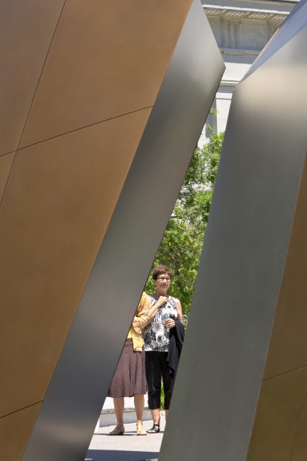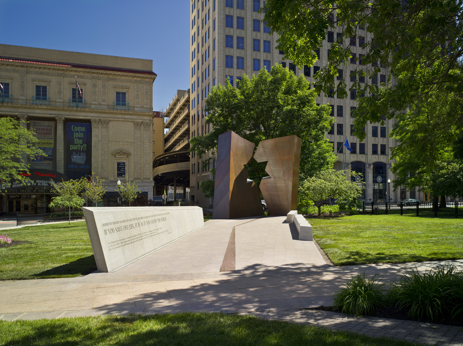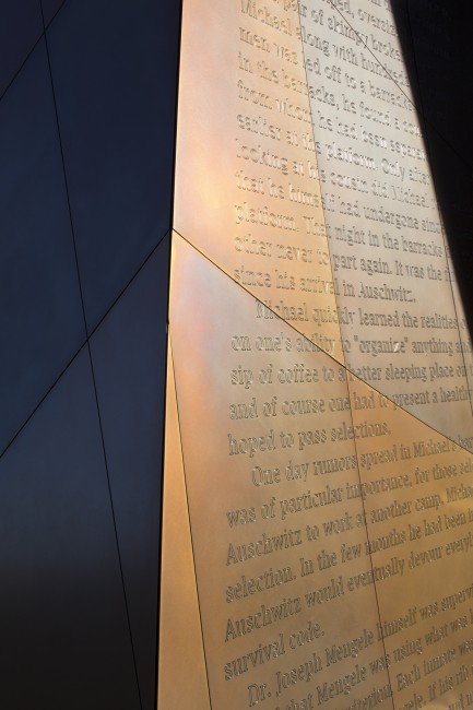 Approaching from the Statehouse, the visitor walks on a limestone walkway between inclined, graduated stone walls and two stone benches towards a pair of large 18-ft-high bronze panels. Embossed with a story told by a survivor of Auschwitz, the panels are also irregularly angled at their inner edges. The planes meet in the center, the jagged edges forming a cutout in the shape of a six-pointed star.