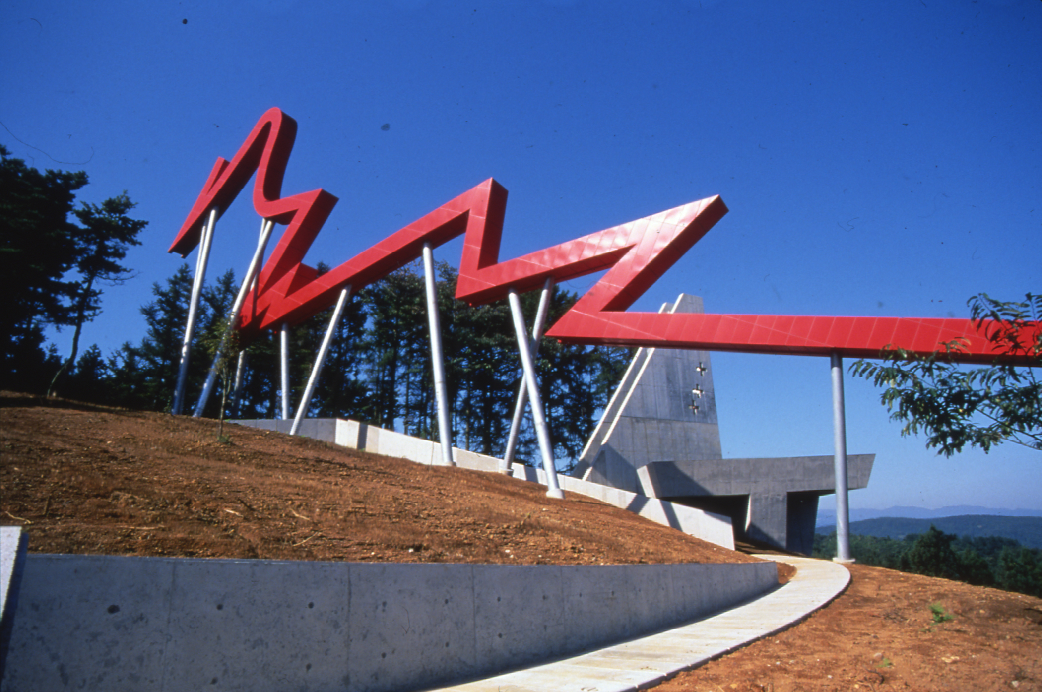A red line orients itself upon an imaginary axis connecting the descending history of the Buried Forest Museum and the ascending horizon of the Tateyama mountain range. This line creates special, ever-changing qualities of light and shadow and appears different during different seasons. In winter, snow collects softly within its angles, and when it rains, water flows along its length toward the visitors’ path of ascension. This physical “connecting line” between thought and vision also highlights the beauty and mystery of the city of Uozu.