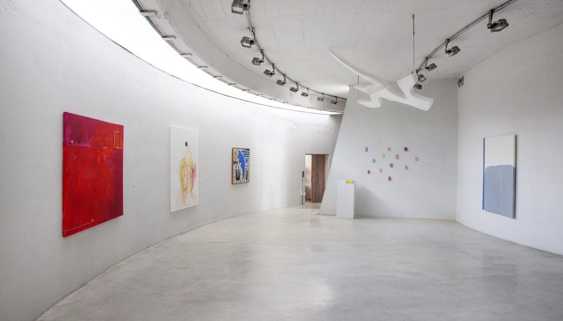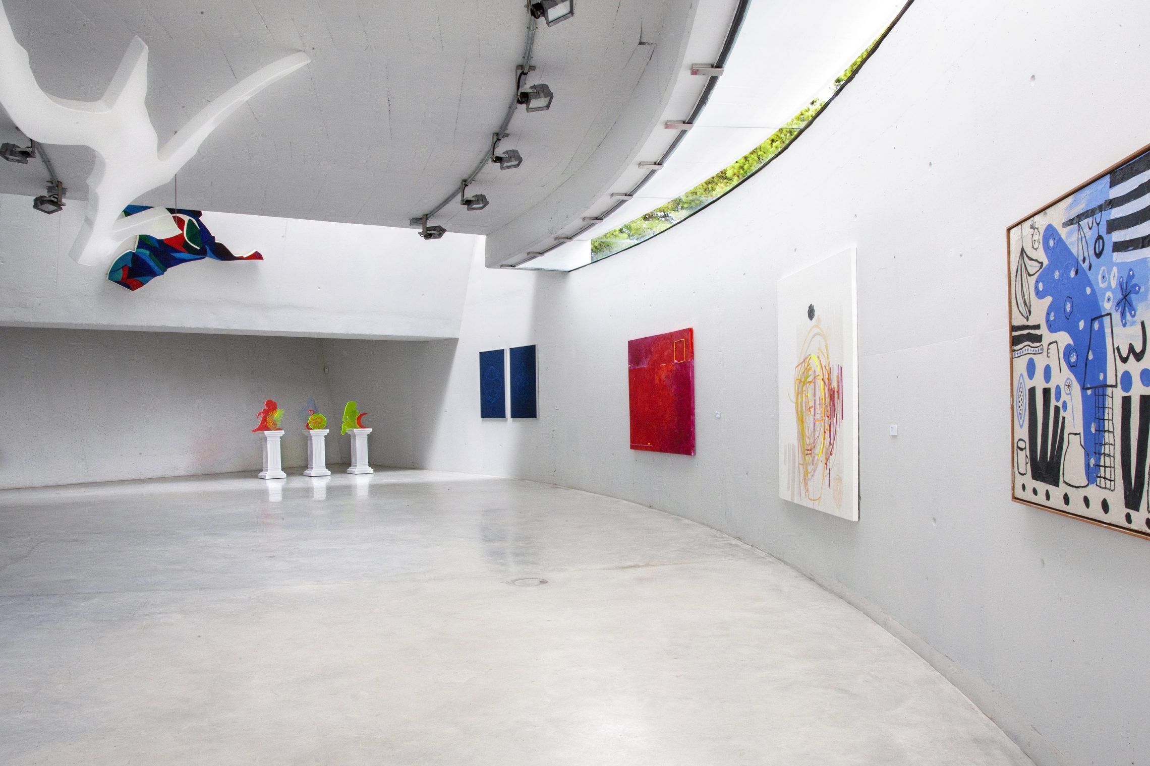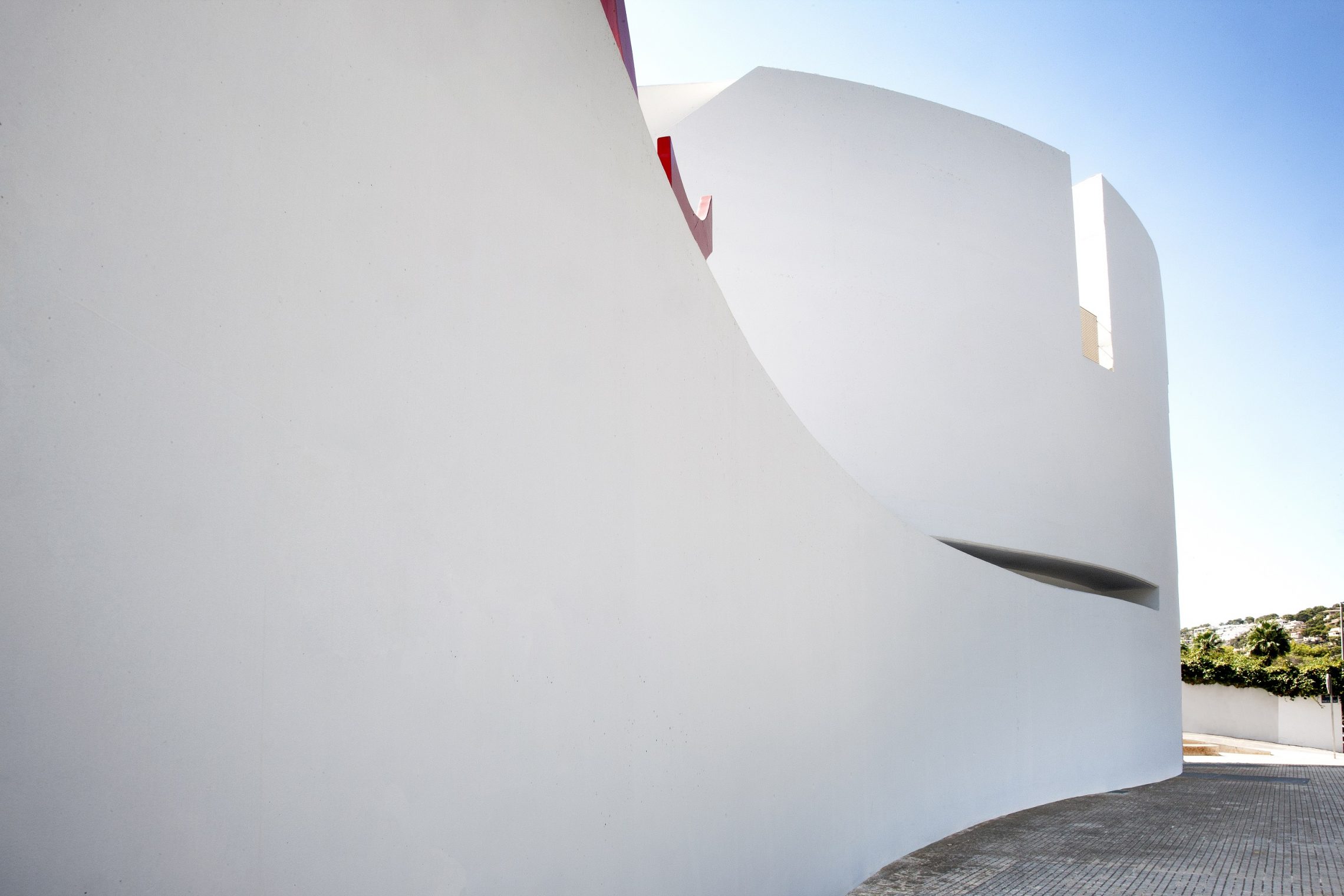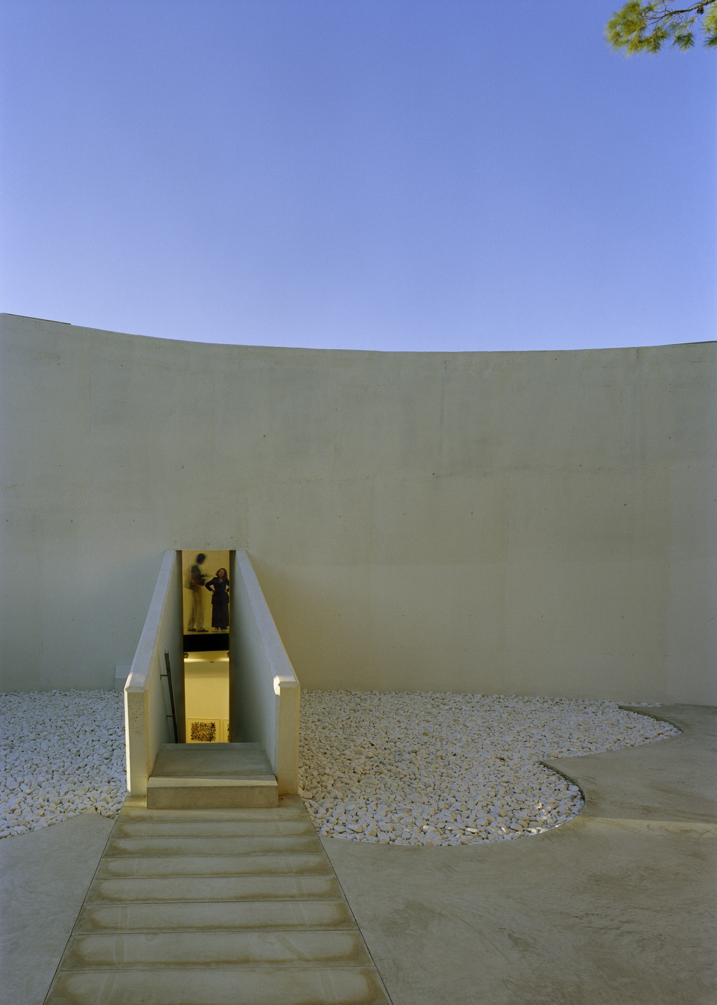 The Studio takes the form of a concrete arc that is cut through with a pair of stairs: one leading up to a roof deck with spectacular views of the sea; the other down from a stone and hardscaped garden that slopes into the ground-floor gallery. The roof holds large scale sculptures, which can be seen from afar. The building houses exhibition spaces, working quarters and a dramatic landscaped garden.