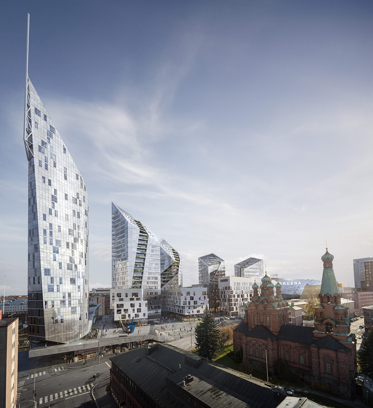 The Nokia Arena project is an ambitious urban renewal project, situated at a pivotal location within Tampere, Finland. It stitches the urban fabric back together across an existing railway and connects East to West, creating a new vibrant hub of high quality living, working, leisure and culture for the city and Finland. The mixed-use program consists of a multi-purpose ice hockey arena with a hotel, five adjacent towers with a podium that includes residences, retail and offices.