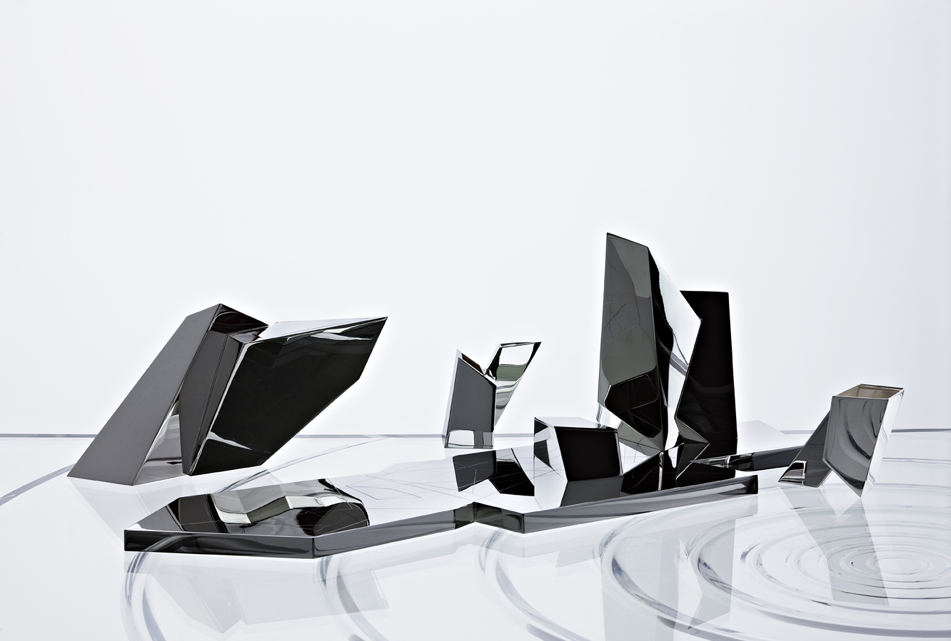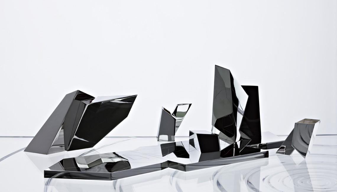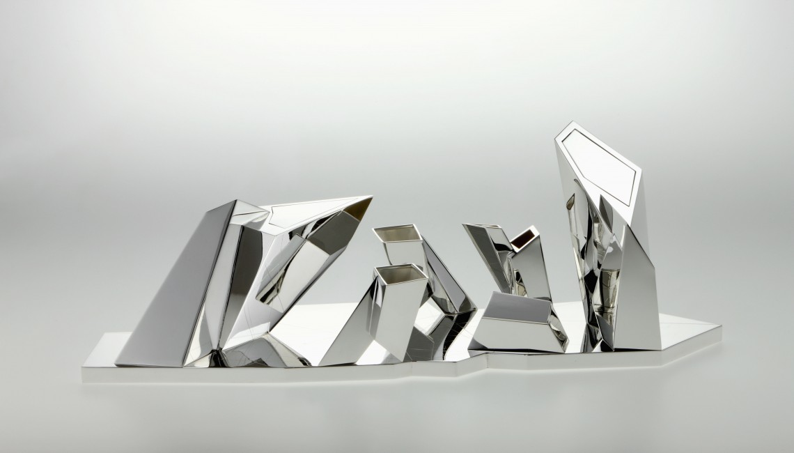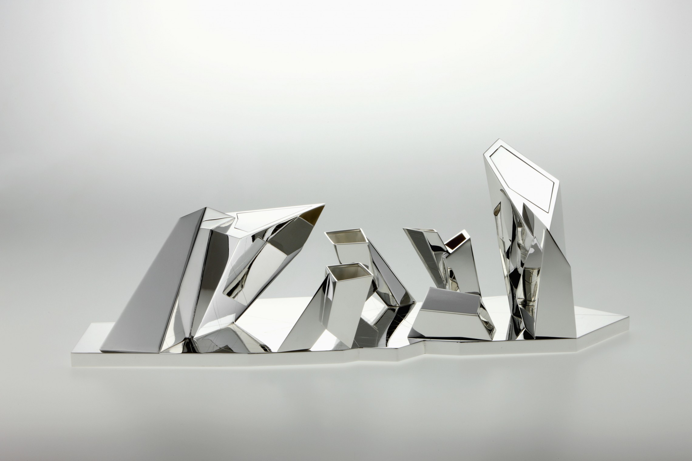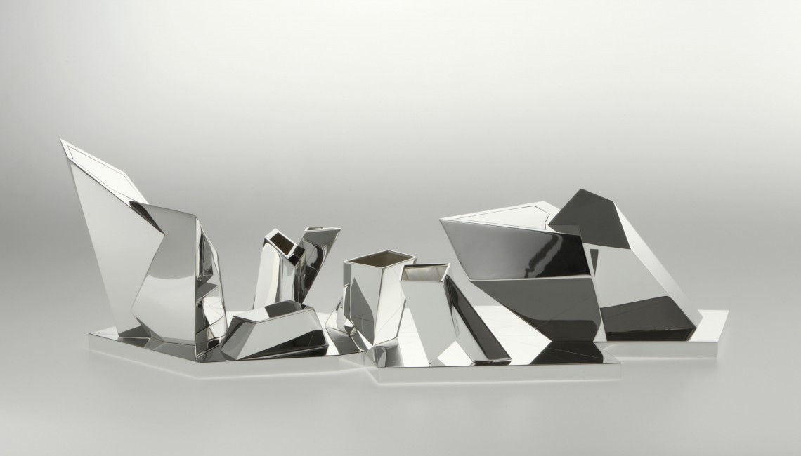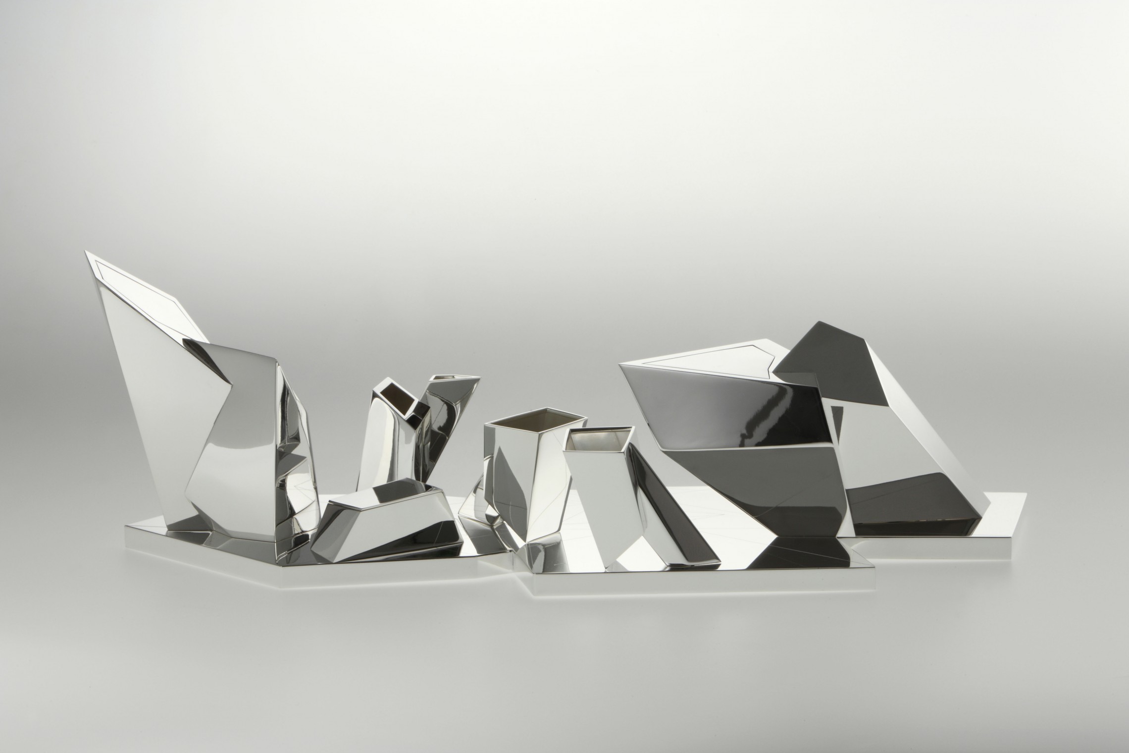 Premiering during the 2009 Milan Design Week in the showroom of the famous Via Manzoni, Daniel Libeskind’s tea set designed for Sawaya & Moroni is his first home accessory. Libeskind’s tea set reflects his unique architectural style that has resulted in iconic buildings all over the world; here that design sense is miniaturized in the form of this striking sculptural object for use in the home. This handmade Sterling silver tea set includes tea pot, coffee pot, creamer, two tea cups, sugar bowl and tray.