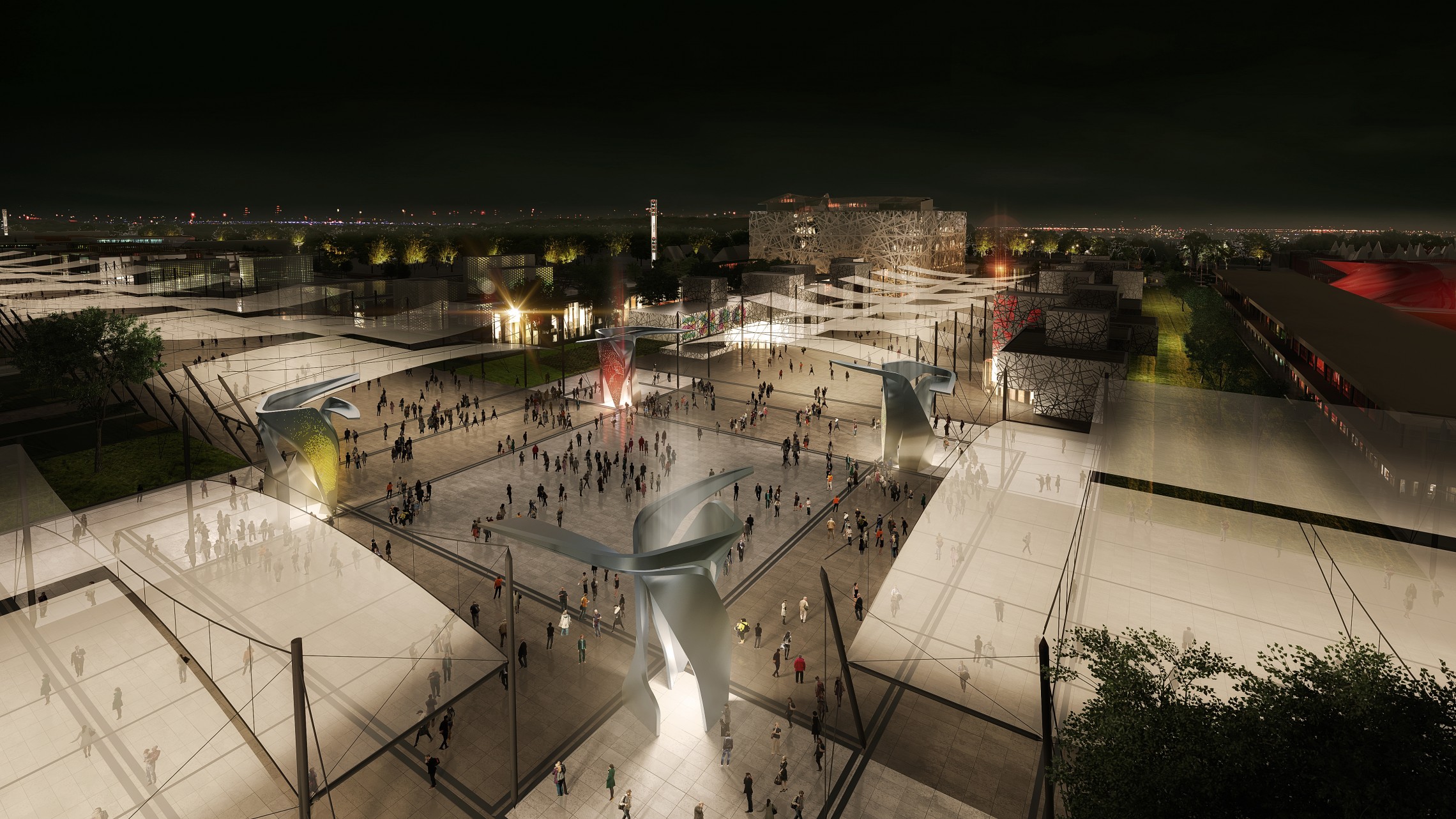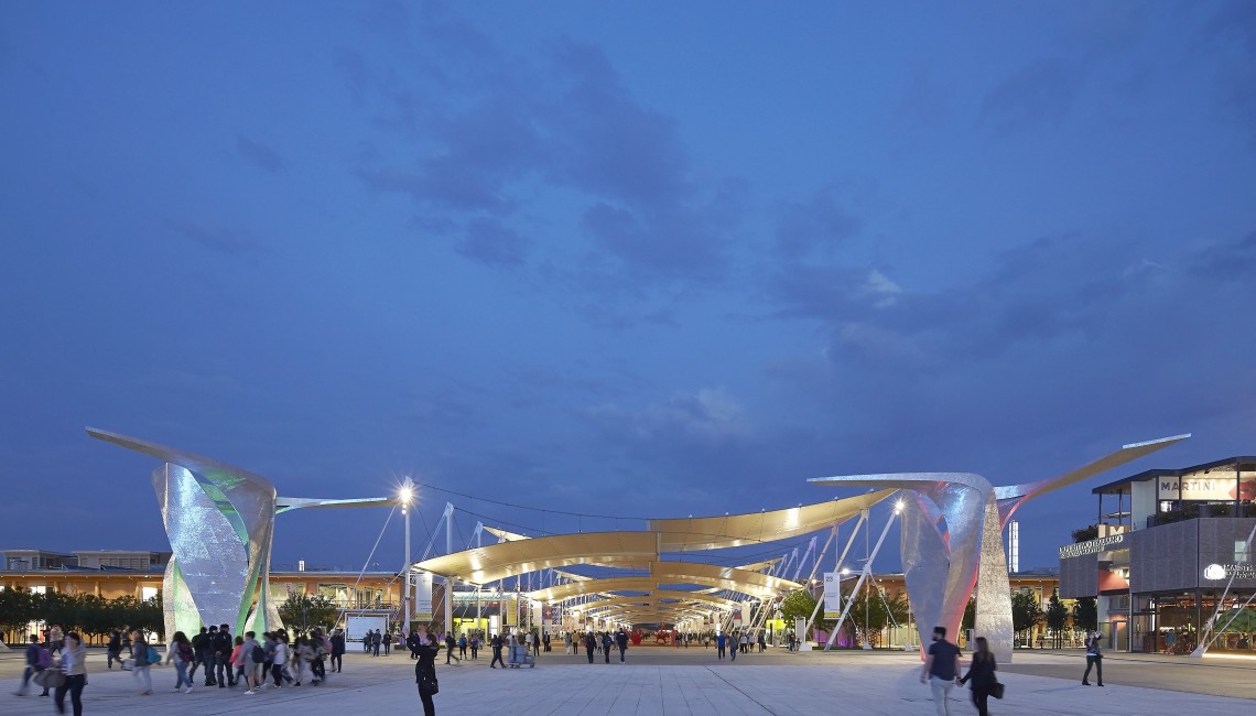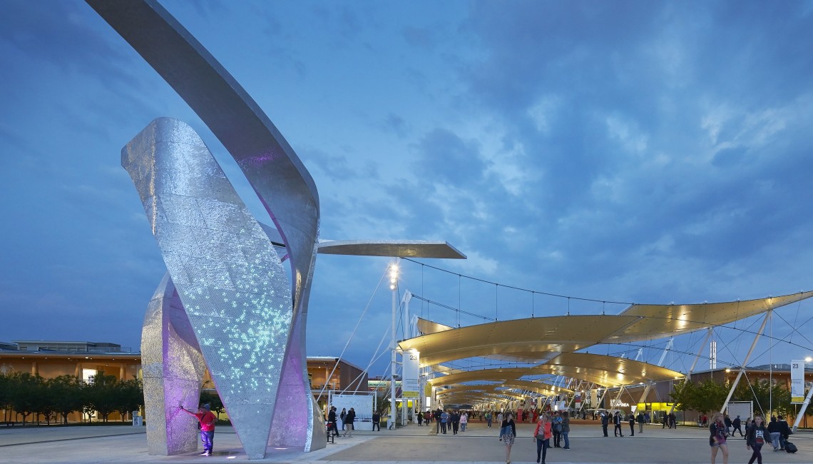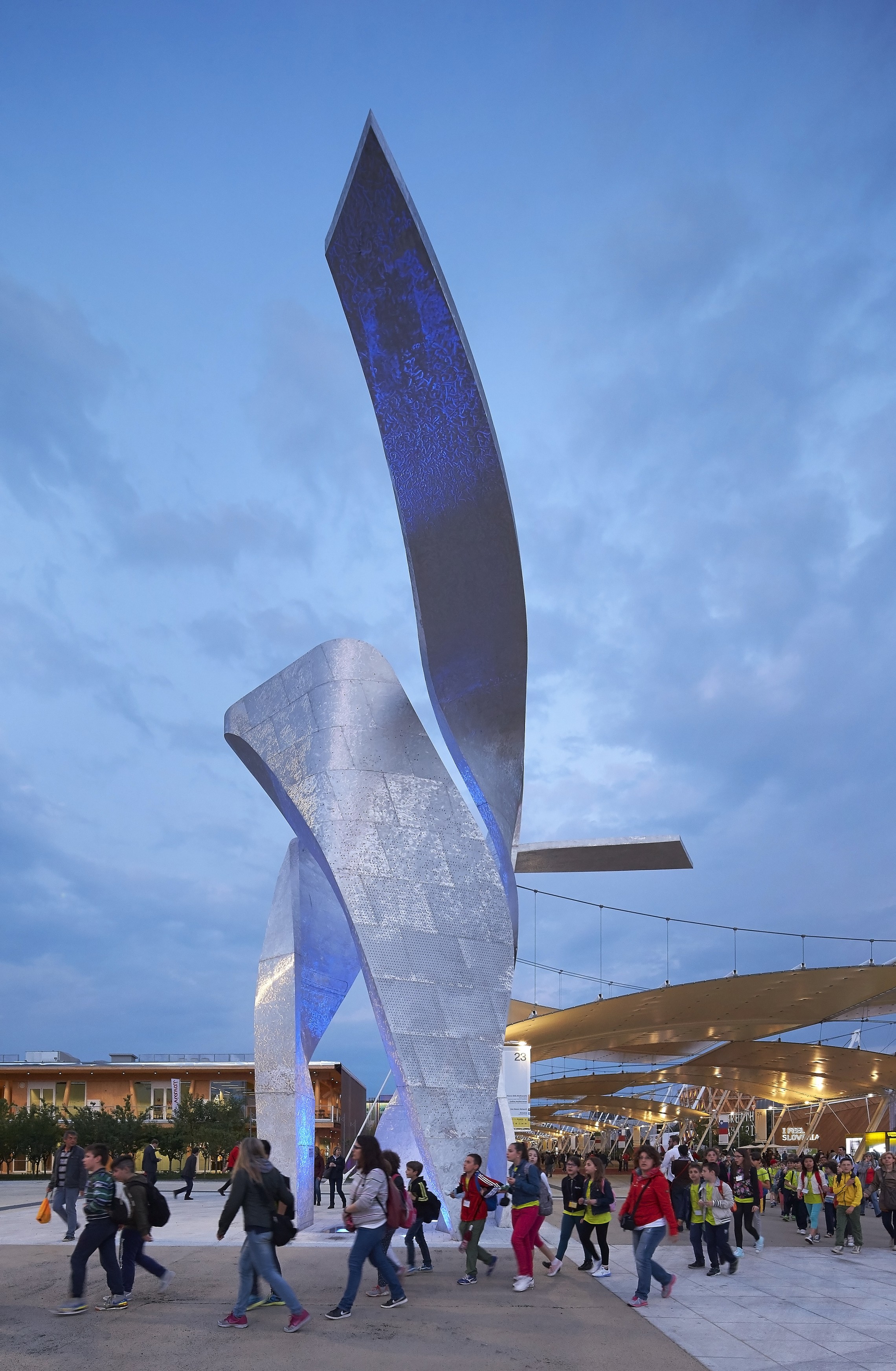 Situated in the heart of the Milan Expo in the Piazza Italia, four 10 meter-high (33 ft.) shimmering tree-like sculptures anchored the four corners of the central square in Milan, Italy. Conceived as gates each structure’s dynamic form spiral out of the ground and spread into two branches spanning 10 meters over the square. Crafted out of brushed aluminium and fitted with innovative LED technology, the Wings animated the public space with a constant flow of pulsating patterns and imagery related to the theme of the Expo: health, energy, sustainability and technology. London-based media agency Innovision provided the creative content for the display surfaces.