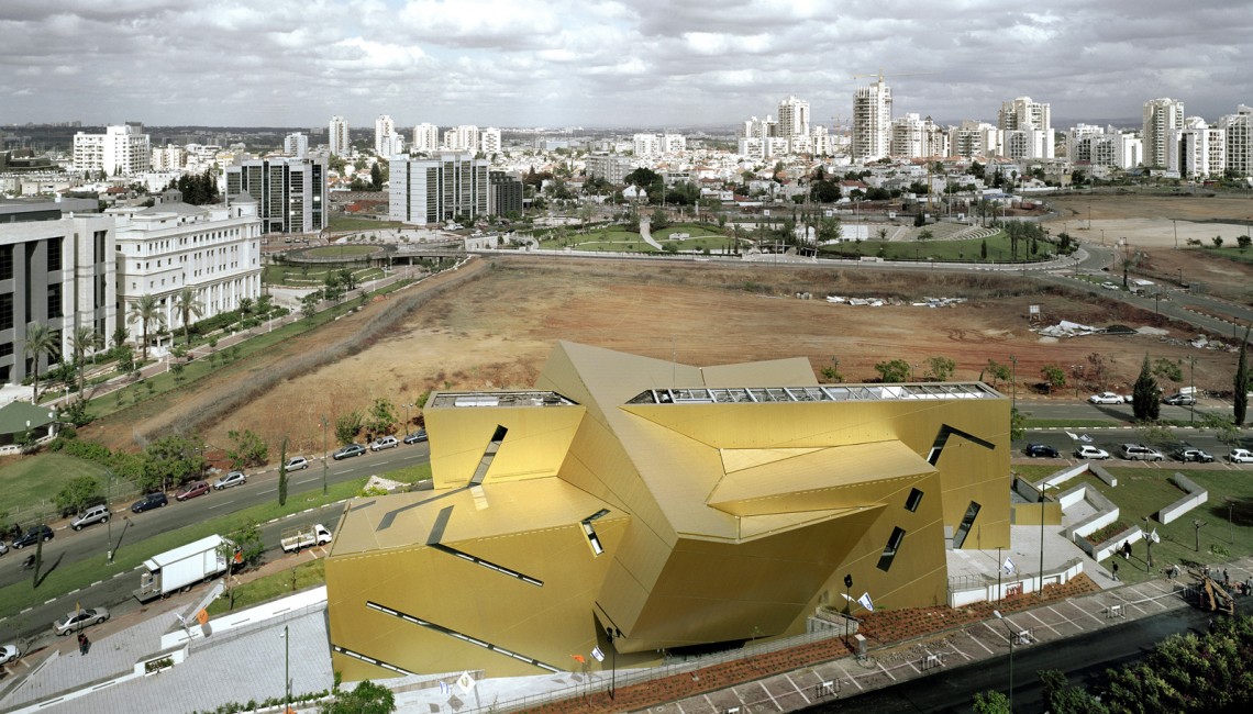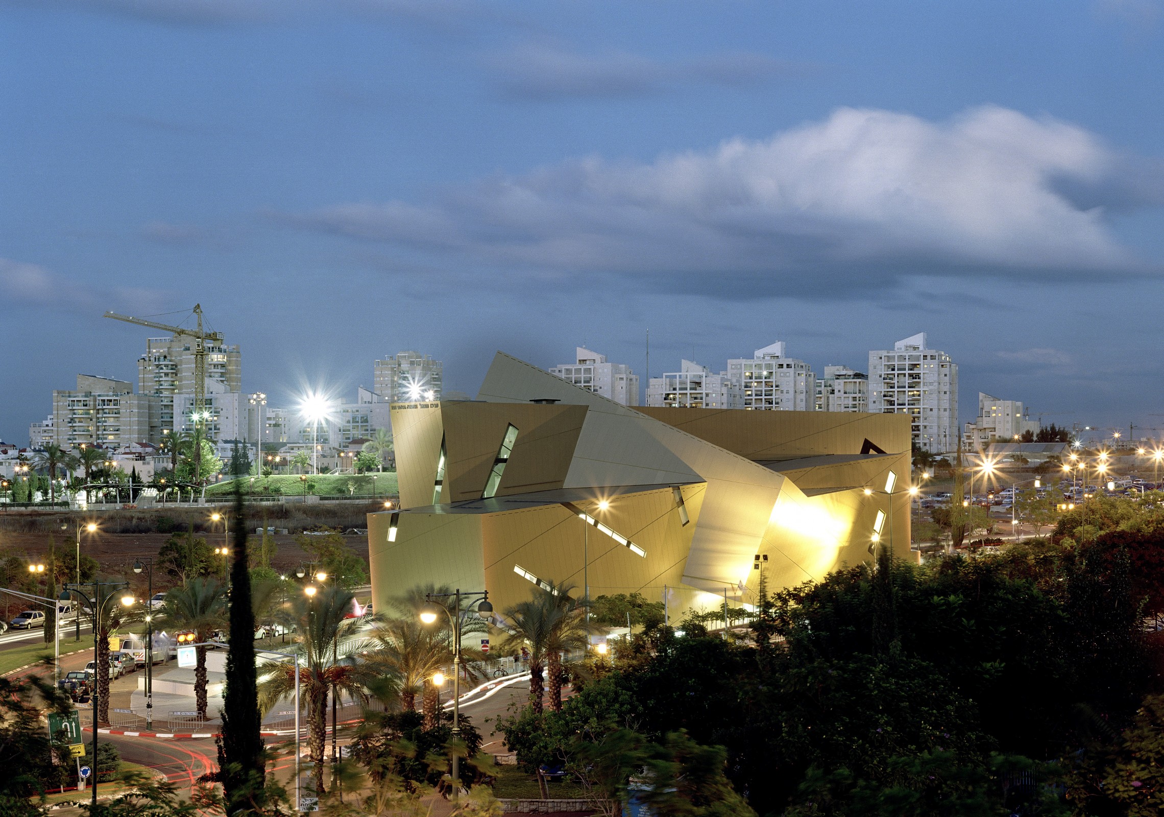 The building is made up of an “open book” perched on top of two horizontal walls like the spine of a book. The book-like form holds a 1000-seat auditorium, which is acoustically suitable for musical performances and lectures. The auditorium lighting permeates through a labyrinth of Hebrew letters that denote an ancient constellation of hierarchies. The interior spaces are a dynamic ensemble of intersecting volumes that create flexible spaces. The ground level can hold seminar and meeting rooms for more than 400 people and accommodate large group events.