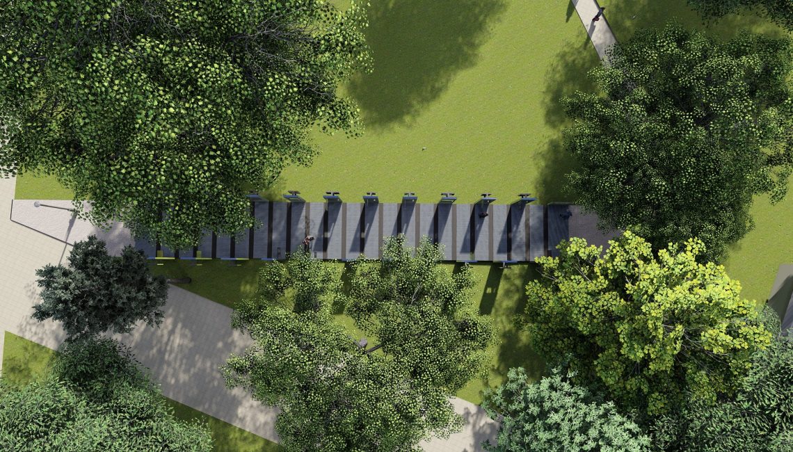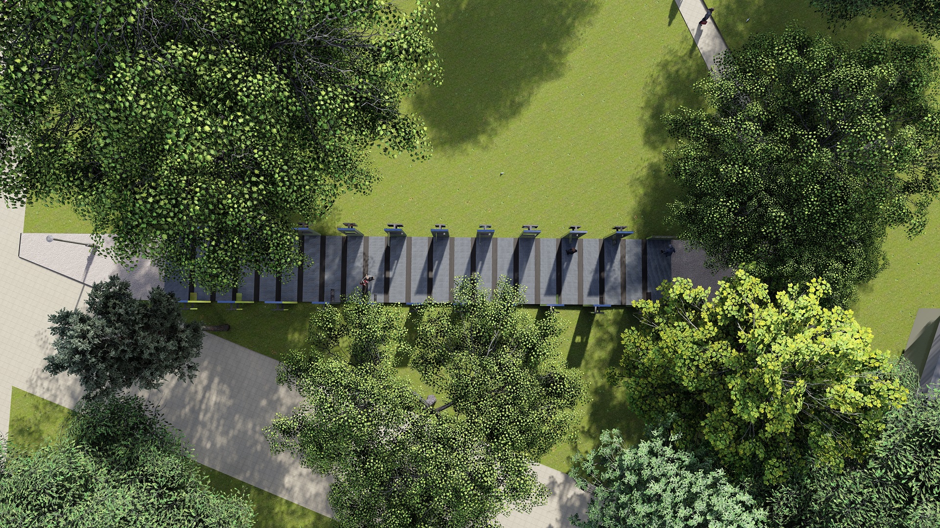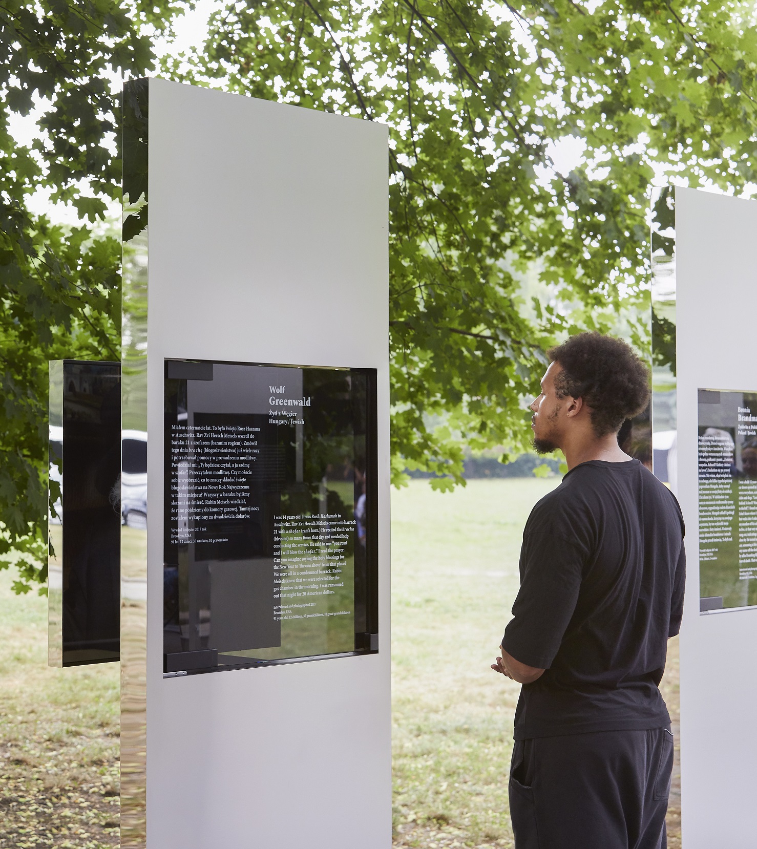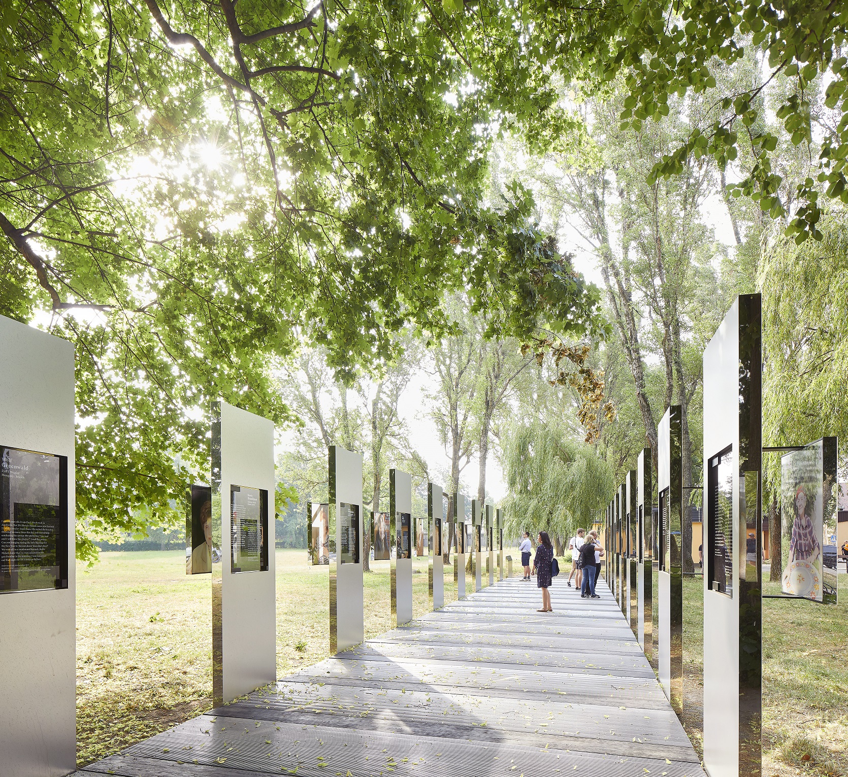 Three-meter-tall, vertical steel panels line up on both sides of a path that veers off the route that leads to the Auschwitz Memorial and Museum. The repetitive pattern of the panels is reminiscent of the stripes from a prisoner’s uniform, suggesting internment, while the exterior mirrored surfaces reflect the surrounding landscape and evoke a physical and spiritual freedom.