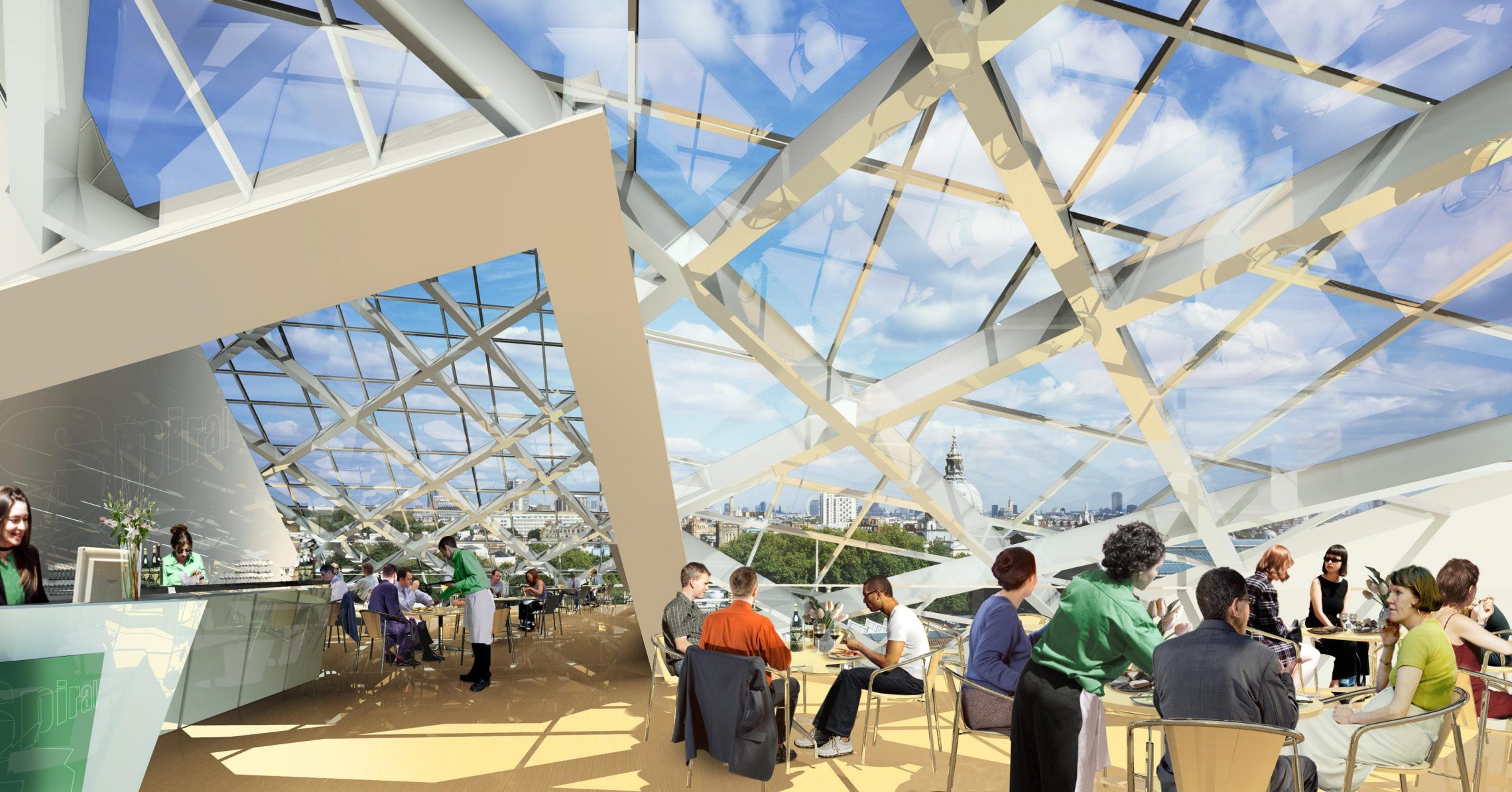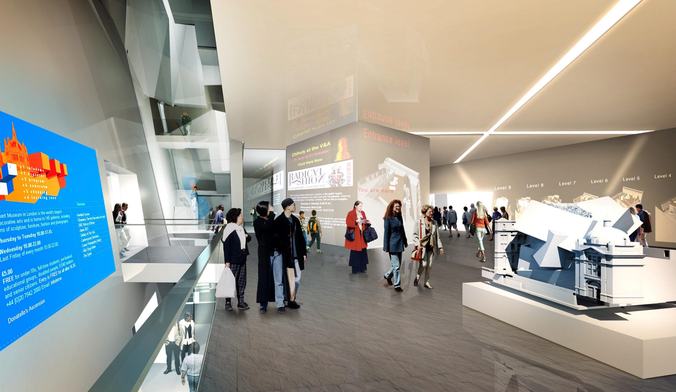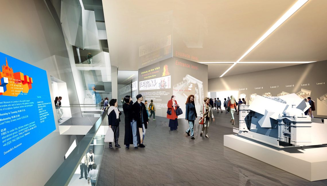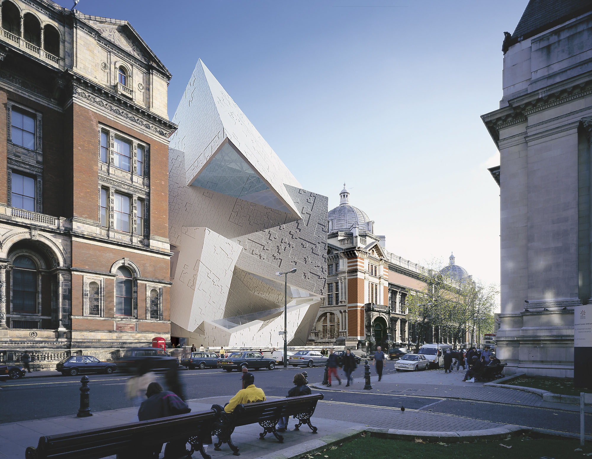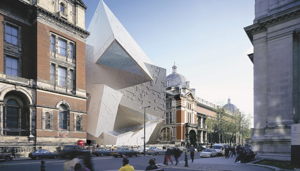 The competition for the new extension to the Victoria and Albert Museum was won by Studio Libeskind in 1996. The design for The Spiral, in collaboration with Ove Arup’s Cecil Balmond, pushed the boundaries of engineering and architectural theory. The design is an upward spiral of intersecting planes, creating a jagged vortex inserted between three Grade I listed buildings. The building is derived from an extruded section of a fractal pattern: a geometric pattern relating to the Golden Section. The extruded line was then wrapped upon itself to create the unique shape of the non-axial spiral. The system of continuous, interlocking wall elements required no supporting beams, thus creating unencumbered, free flowing interior spaces that mirror the movement in the façade.