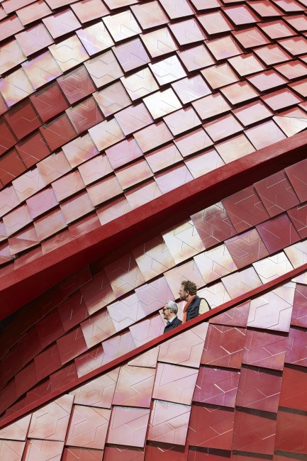 The pavilion is clad in more than 4,000 red metalized tiles that Libeskind designed with the Italian company Casalgrande Padana. The geometric ceramic panels not only create an expressive pattern that is evocative of a dragon-like skin, but also possess highly sustainable self-cleaning and air purification properties. The three-dimensional surface is coated with a metallic coloration that changes as light and viewpoints shift. At times it will appear as deep crimson, then a dazzling gold, and even, at certain angles, a brilliant white. The tiles are installed with a state-of-the-art cladding support system that gives a rhythmic pattern and mathematical form to an otherwise supple, torquing shape. Two spiraling stairs, echoing the form, ascend the pavilion to the south, and to the north from the Lake Arena entrance, serving both as circulation and seating.