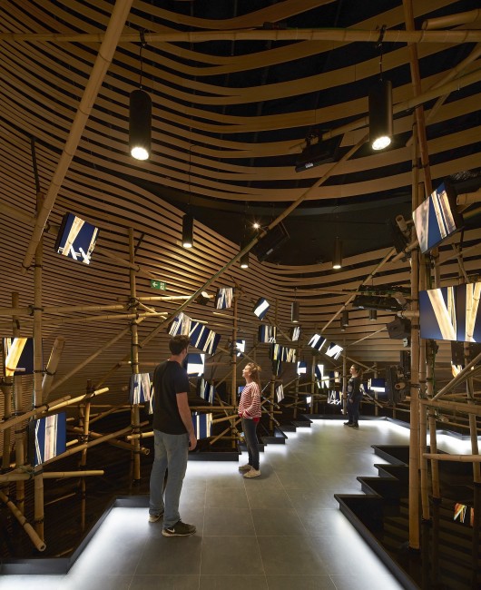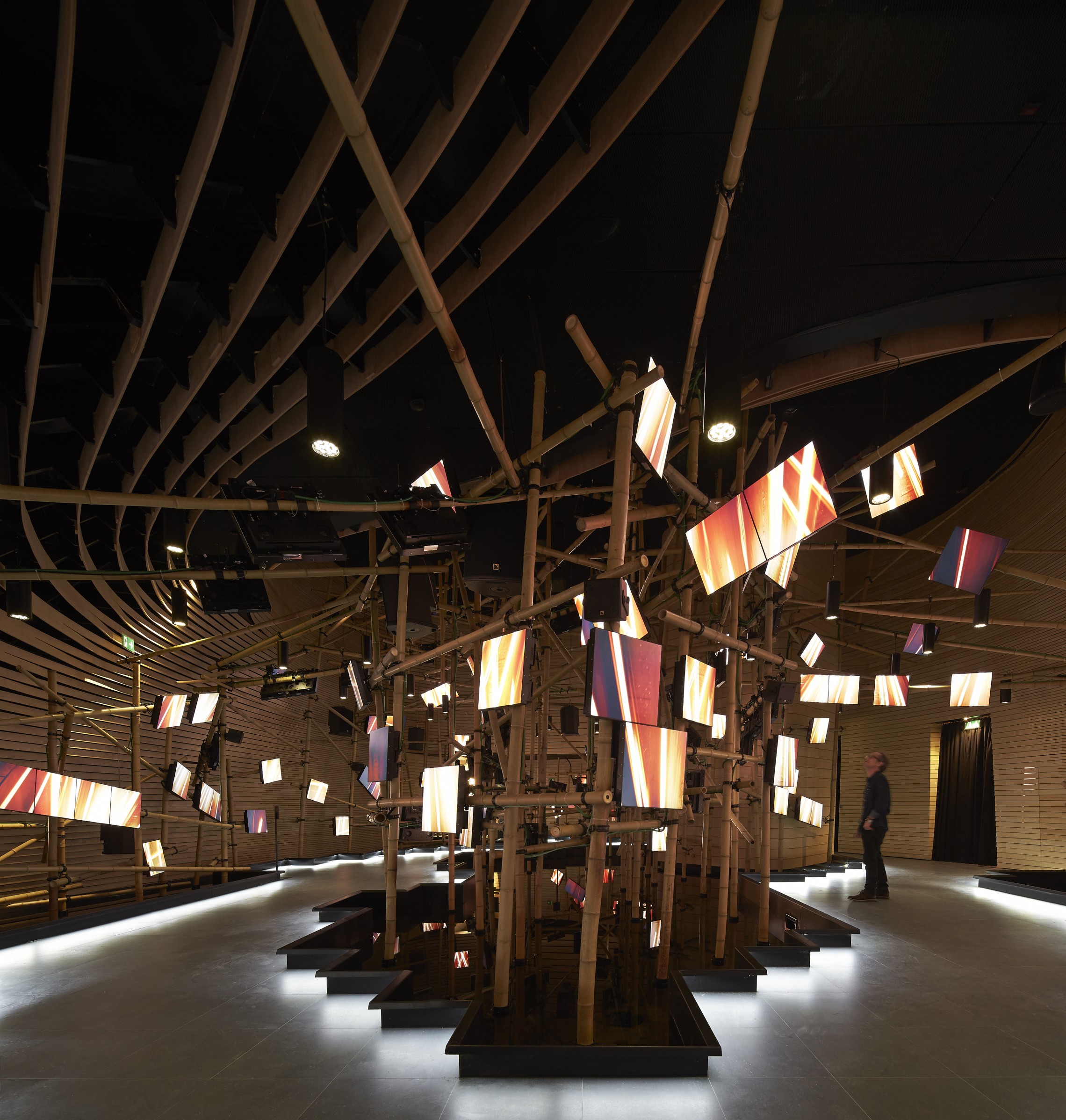 Inside the pavilion, visitors encounter an exhibition space filled with a constellation of 200 screens mounted to a matrix of bamboo scaffolding. The forest of screens and bamboo floats above a winding reflecting pool that borders the visitor pathway.
