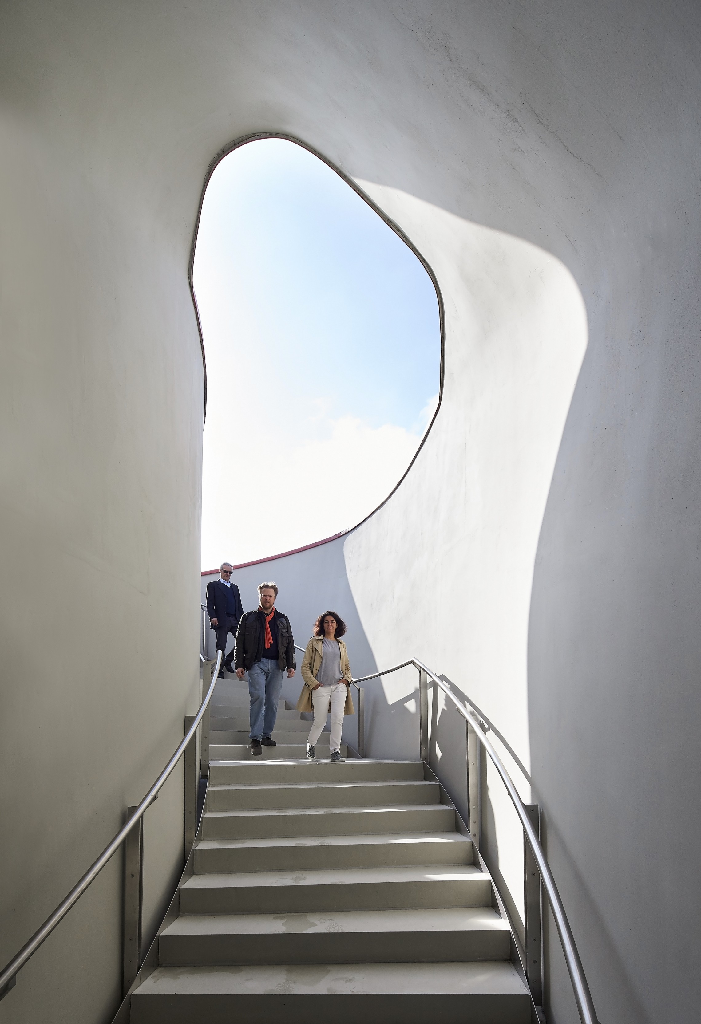 Situated on the southeast edge of the Lake Arena, the 800-square meter pavilion appears to rise from the east, forming a dynamic, vertical landscape. The design features a sinuous geometrical pattern that flows between inside and outside. A grand staircase, clad in warm grey concrete, carves through the red serpentine form and guides visitors to the upper level. A roof-top observation deck with a planted garden will provide stunning views of the lake and near-by Italian pavilion.
