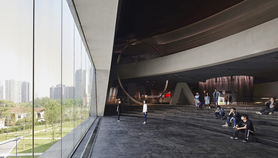 On the second floor of the museum is a semi-circular auditorium that features an oculus and opens to reveal a panoramic view of the old steelworks next door. A central atrium connects the three levels of the building while ushering natural light into the galleries. On the top gallery floor, the space is reserved for on-going temporary exhibitions. At the apex of the building, a lattice opening in the structure allows for views out towards the city of Wuhan.