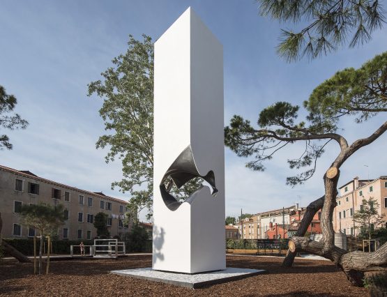 The Memoria e Luce is a memorial located in Padua, Italy for victims of the 9/11 attacks on New York City.  A twisted steel beam salvaged from the wreckage of the World Trade Center, which was donated by the United States to the Veneto Region and in turn to the City of Padua, was used to realize the design of an open and luminous book. The memorial was created with the support and collaboration of Permasteelisa.