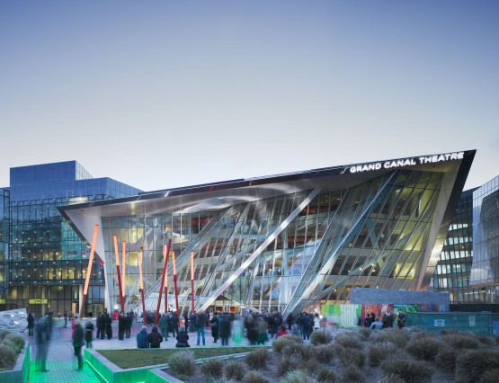 Located on the Dublin waterfront, the Bord Gáis Energy Theatre, formerly the Grand Canal Theatre, is a 2,000-seat theater at the heart of a multi-use complex conceived for by the City of Dublin as part of a plan to revitalize its docklands. Studio Daniel Libeskind completed the theatre in 2010 and an office complex called the Grand Canal Harbour development a year later. The theater overlooks a public plaza designed by Martha Schwartz Associates. Like a grand outdoor lobby, the plaza invites the public to view the soaring glass façade of the theater much like a glass curtain, which tilts…