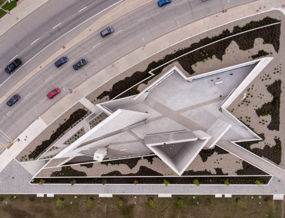 Studio Libeskind’s extension to the Denver Art Museum is the Studio’s first building to reach completion in the USA.  Silhouetted against the majestic backdrop of the Rocky Mountains, Libeskind’s design consists of a series of geometric volumes inspired by the peaks and valleys of the mountain range.  A sharply angled cantilevered section juts across the street, pointing towards the existing Museum by Milanese architect Gio Ponti, which first opened in 1971. The Frederic C. Hamilton Building, as the 146,000-square-foot Denver Art Museum extension is named, is clad in an innovative new surface with 9,000 titanium panels that cover the building’s surface…