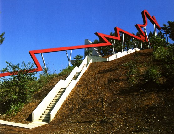 Outside Line, an installation situated in the Sports Park near the city of Uozu, Japan, was proposed as a place to contemplate the relationship between man and nature. The project was inspired by the search for a contemporary understanding of space and light, and its design was informed by a precisely determined web of conceptual, topographical relationships between objects and space, eye and mind. A red line orients itself upon an imaginary axis connecting the descending history of the Buried Forest Museum and the ascending horizon of the Tateyama mountain range.  This line creates special, ever-changing qualities of light and…