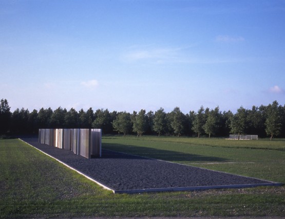 This quiet meditation garden is located in the ‘town without a history’ of Almere, The Netherlands. The garden consists of an observation platform, three narrow water canals, and a fourth dry channel on which a rectilinear volume is resting.  These lines direct themselves toward three particular locations: Salamanca, Paris, and Almere. They signify a world location in which love (Juan de la Cruz) and fire (Paul Celan) intersect in Almere’s future. The inscribed ciphers refer to the encounter between Juan de la Cruz and Paul Celan in the newly reclaimed land. They become readable at precisely those times when the…