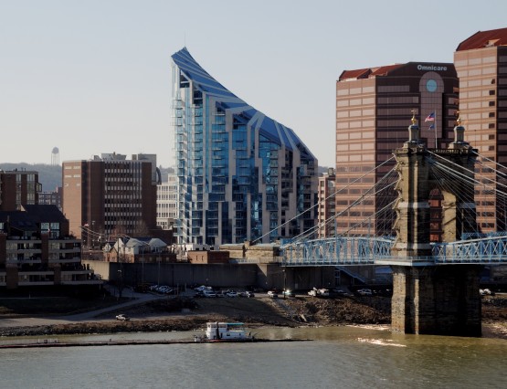 The Ascent at Roebling’s Bridge in Covington is a stunning testament to the vitality and rebirth of the greater Cincinnati area, bridging the gap from the area’s industrial roots to its contemporary identity. Situated on a 1 acre site adjoining the slipway to Roebling’s Bridge, the building reaches 300 feet at its pinnacle and is a departure from the surrounding waterfront buildings. Even so, the building features a color palate that echoes the trusses and cables of the bridge, paying homage to Roebling while also suggesting the promises of a digital future. The ascending crescent form and sloped rooflines offer…