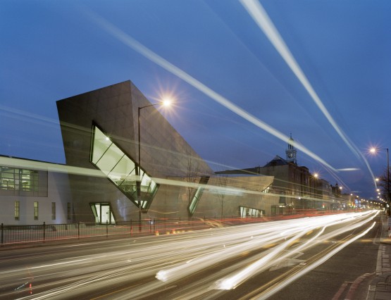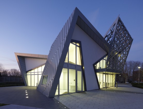 The Graduate Student Centre for the London Metropolitan University is a striking addition to the bustling block on London’s Holloway Road. Composed of three intersecting volumes, clad with embossed stainless steel panels for a shining and ever-changing surface, the Graduate Center houses a lecture theater, seminar rooms, staff offices and a café for the university’s graduate students. The interiors are filled with natural light by way of large windows of geometrical cuts and slashes. The Centre serves not only as a facility to enhance the staff and student experience, but acts as a major gateway to the University on Holloway…
