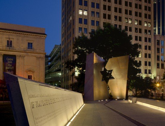 This outdoor memorial in Columbus, Ohio was conceived to keep alive the memory of the millions who lost their lives in the Holocaust and the American soldiers who liberated those in concentration camps.  Studio Libeskind’s design encourages the contemplation of ideas and values that cut across generations, ethnic identity, and creed. Approaching from the Statehouse, the visitor walks on a limestone walkway between inclined, graduated stone walls and two stone benches towards a pair of large 18-ft-high bronze panels.  Embossed with a story told by a survivor of Auschwitz, the panels are also irregularly angled at their inner edges.  The…